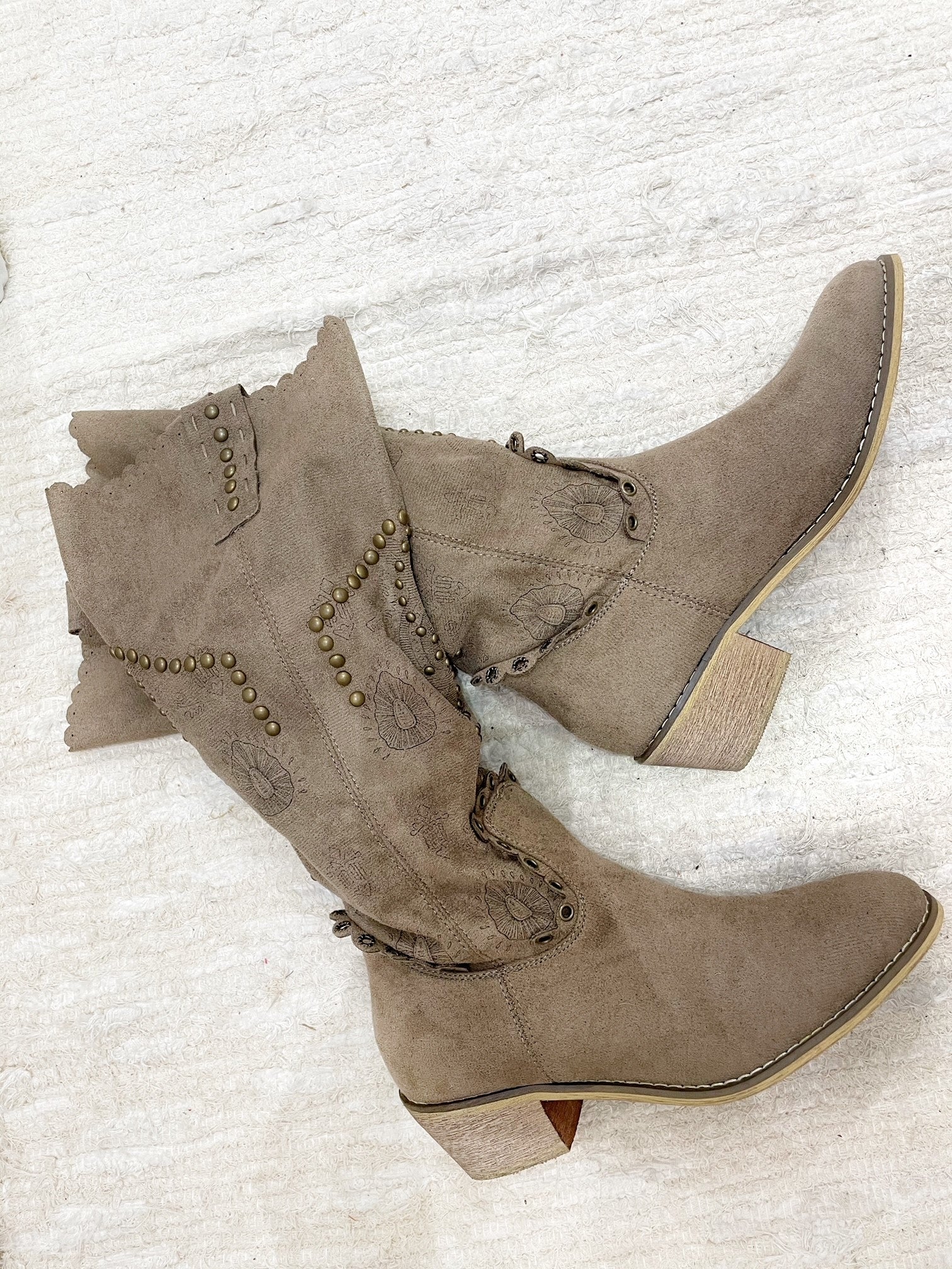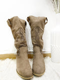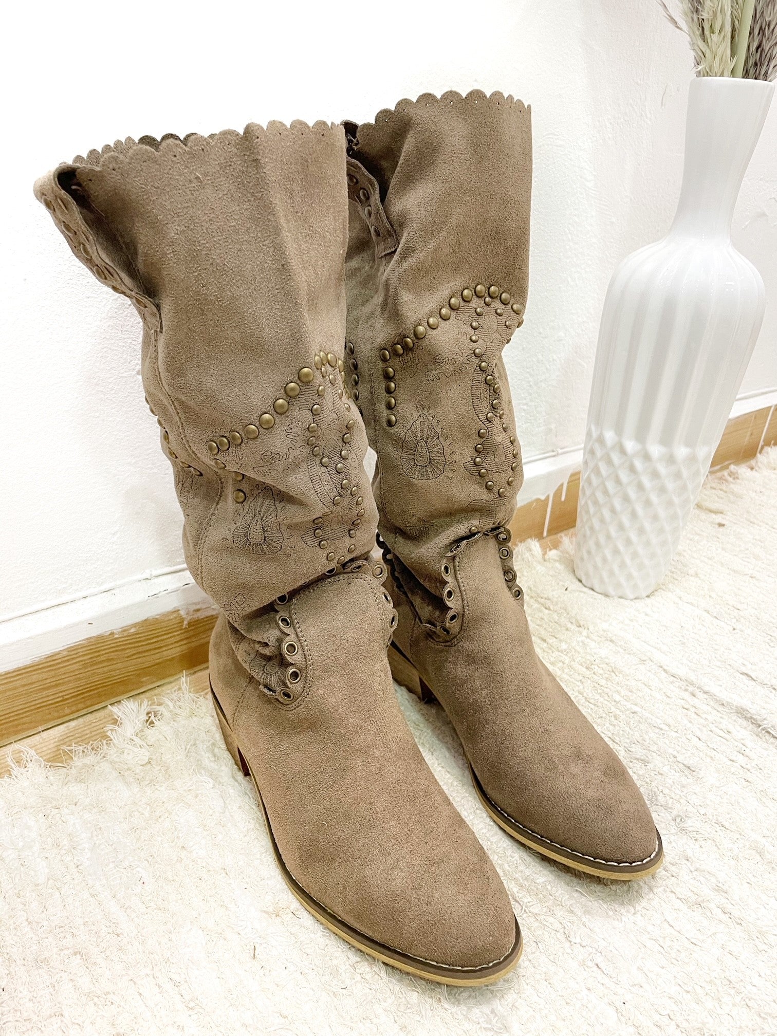 Bota Campera en color taupé, un color neutro que combina a la perfección con cualquier tipo de look. Son blanditas y tienen caída, no son rígidas. Tienen tachas doradas mate en la caña y un tacón de 4 cm horma súper cómoda tallan con el número