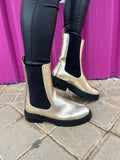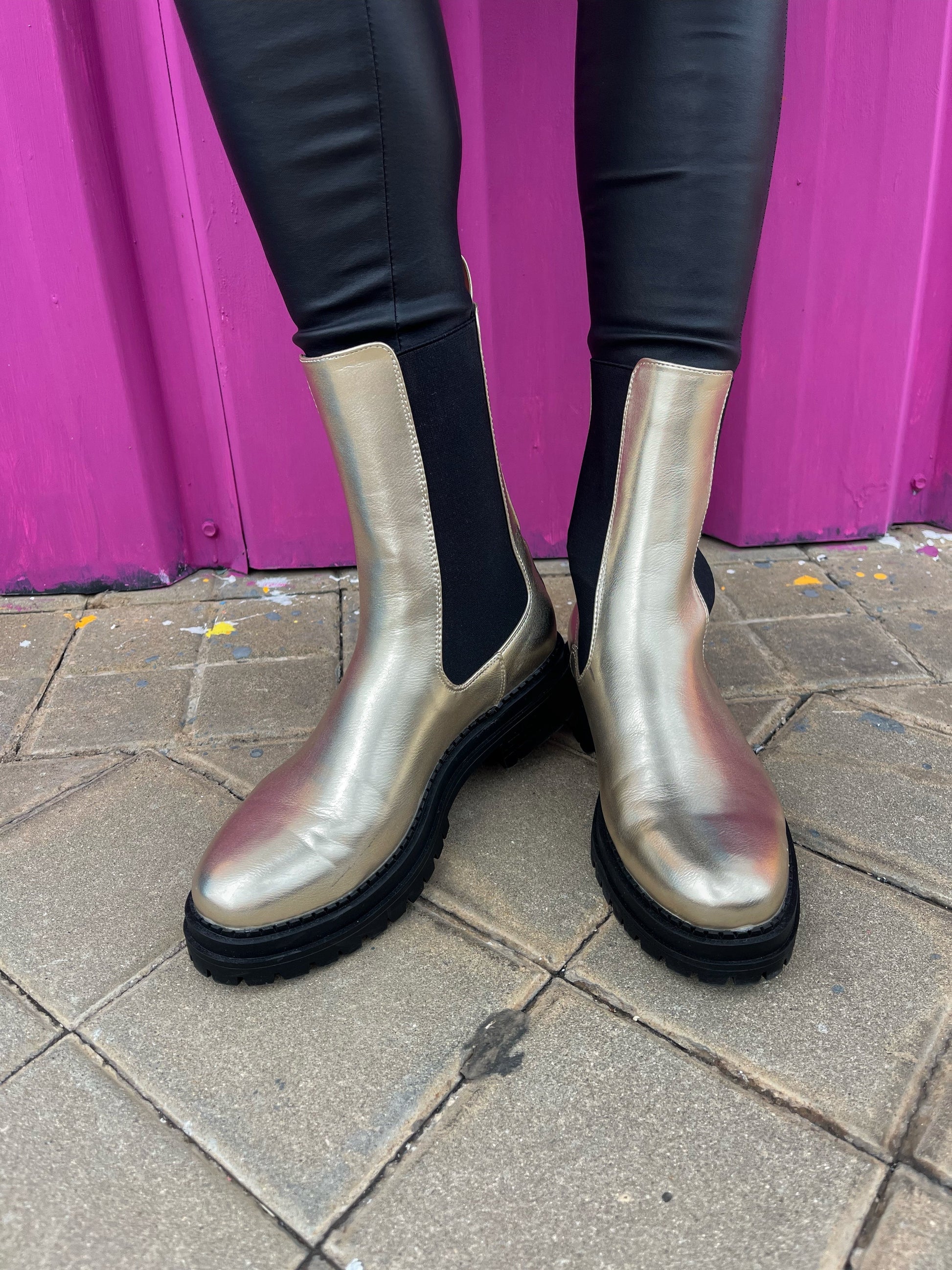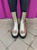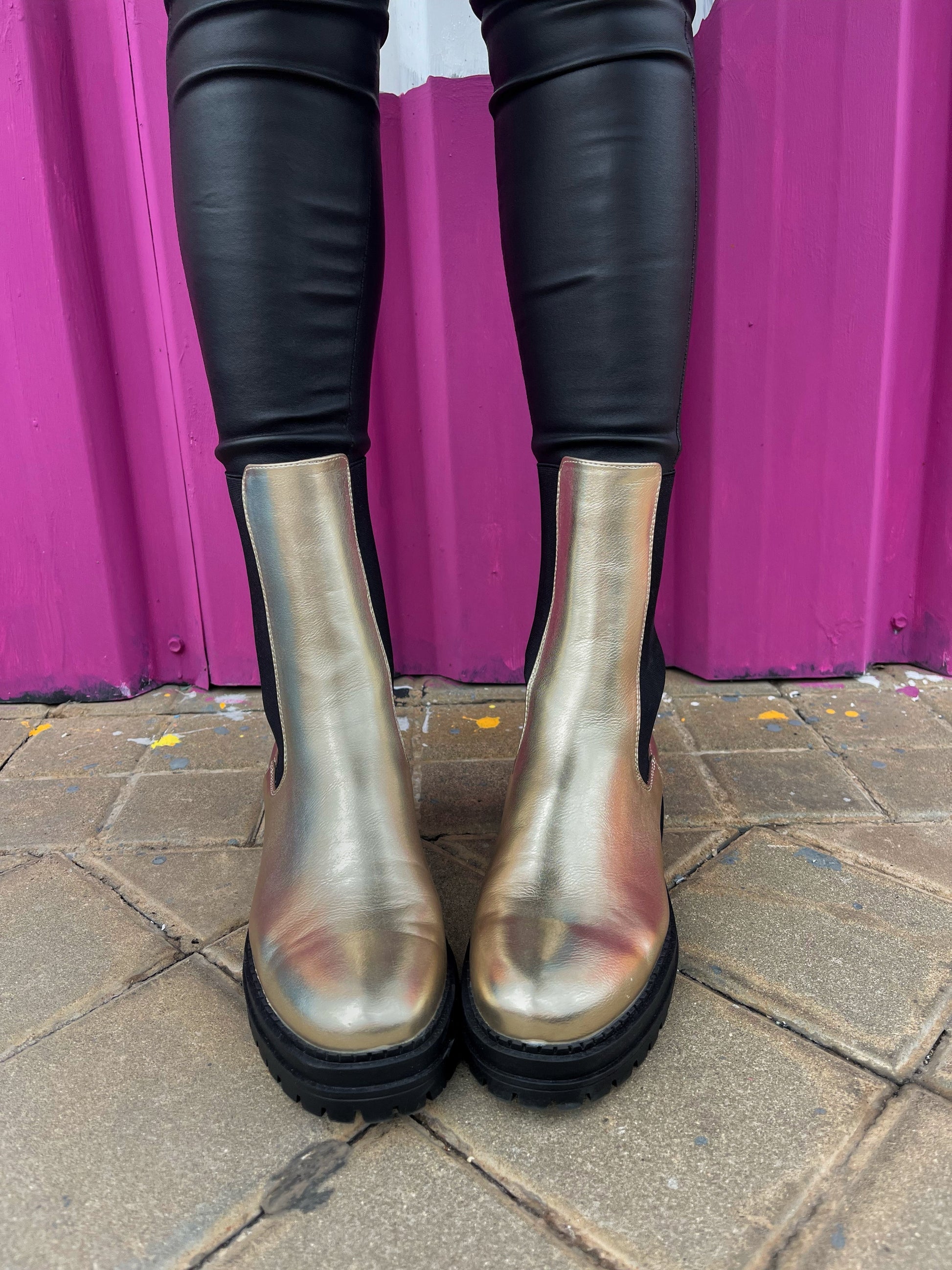 Botas track en color doradas con detalles de gomas laterales y suela en color negro. Son súper cómodas y no pesan mucho. Tienen un color dorado muy sutil y discreto. Tallan normal.