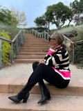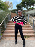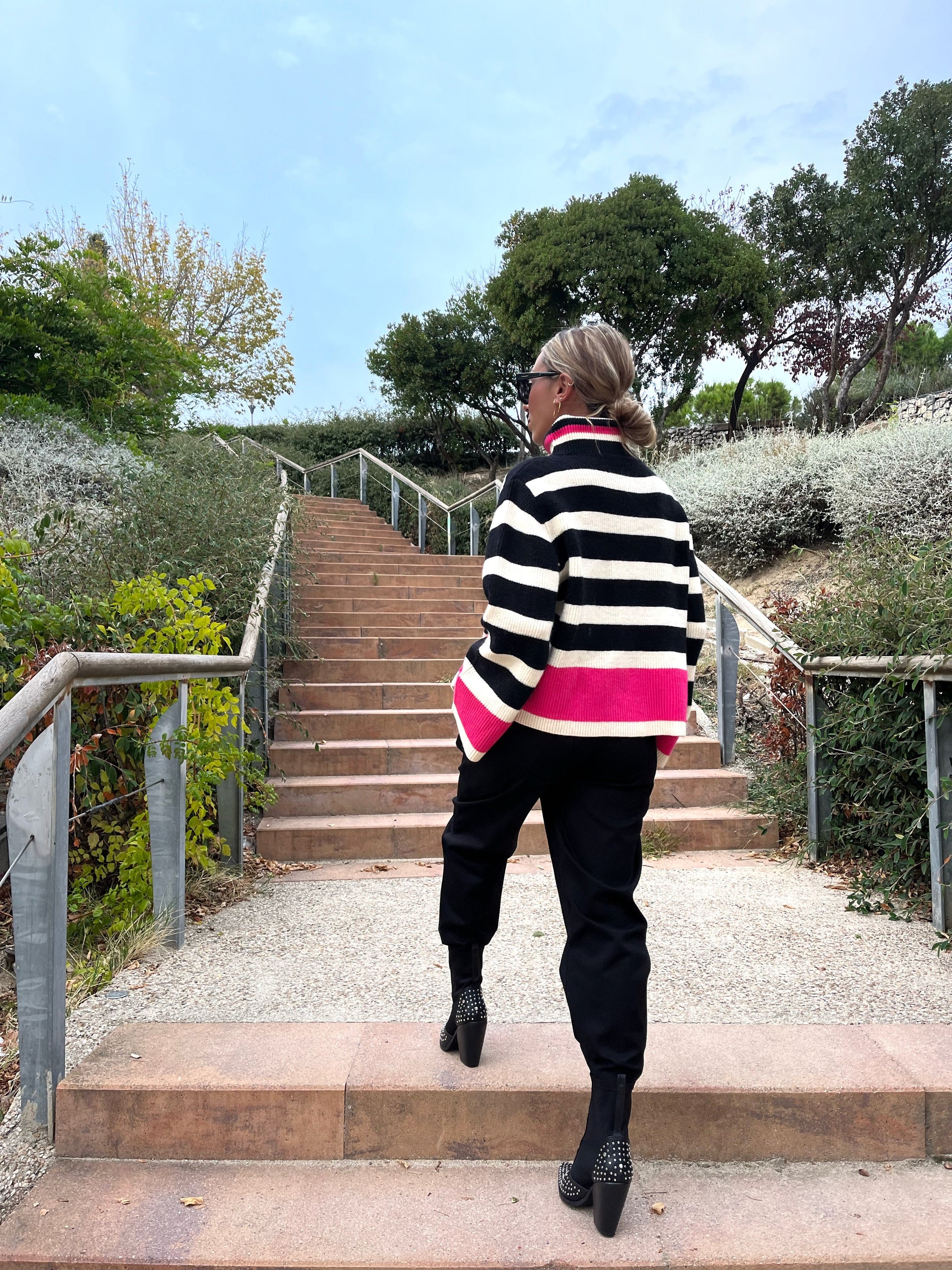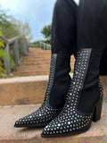 Botín negro con tachas plateadas en parte delantera y parte de la caña frontal y parte trasera encima del tacón. Laterales de lycra. Súper cómodos ( talla pequeño) Altura tacón : 11CM