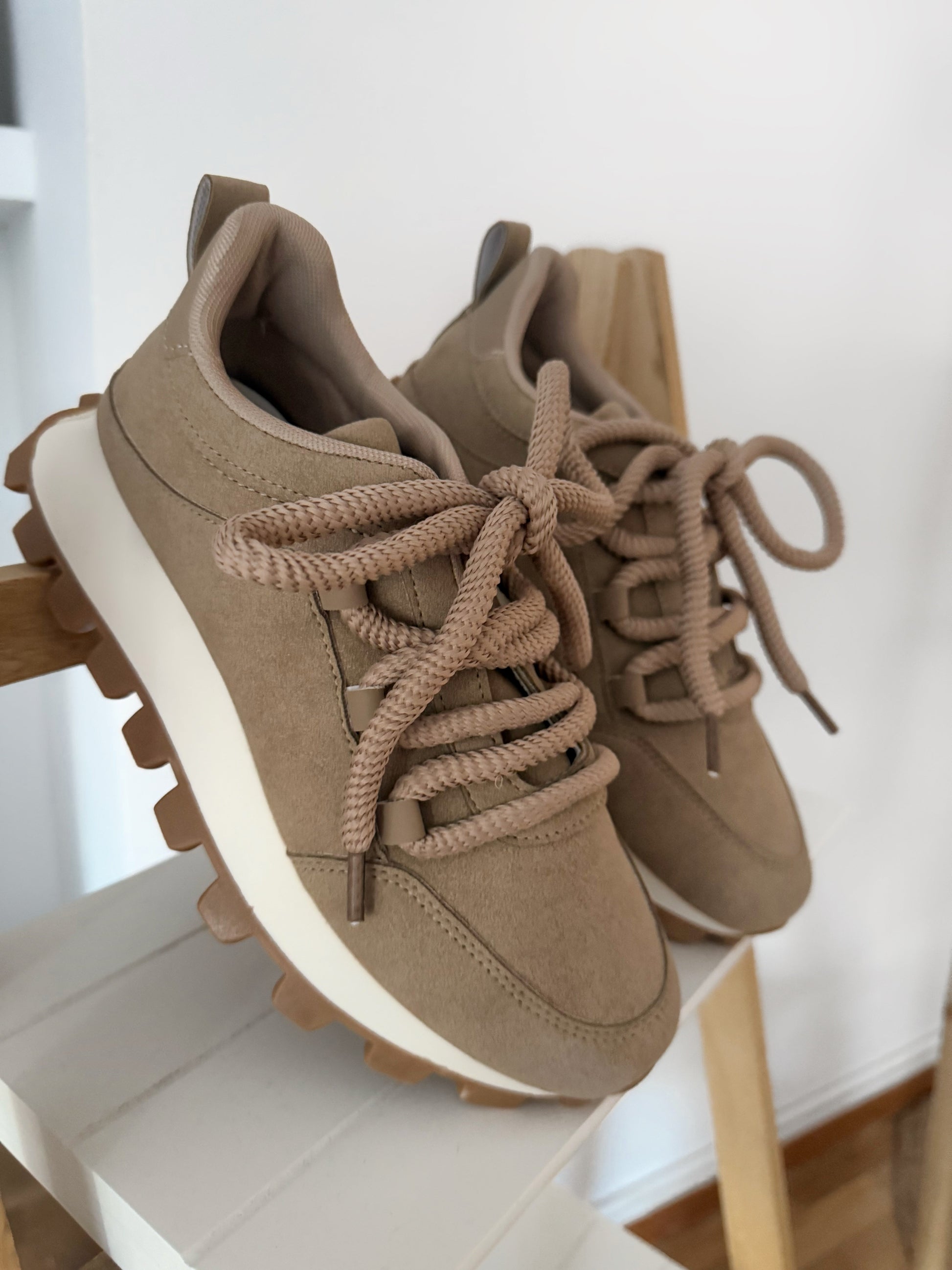 Deportiva de antelina en color camel con cordones satinados en color camel. Tiene plataforma en color crudo y suela tipo track. No pesa nada, es ligera y tiene una horma súper cómoda. Talla justo con el número.