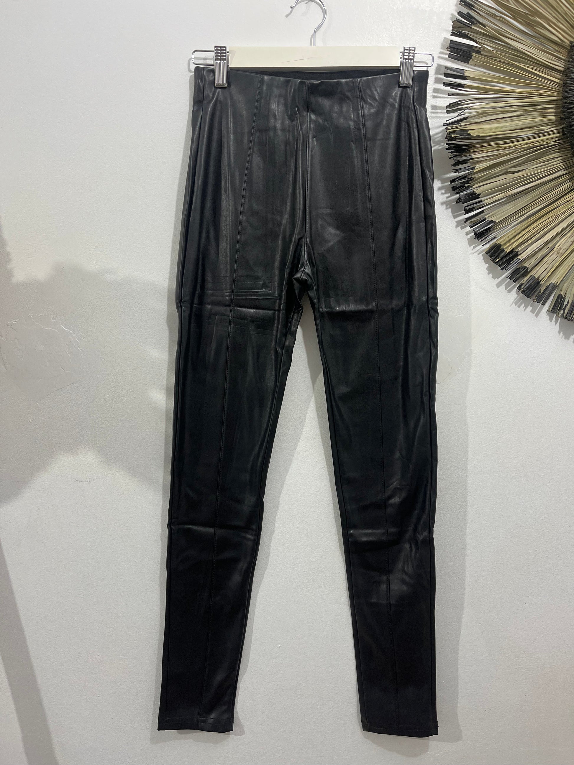 Leggins de polipiel en color negro. Son de tiro medio/alto. Pitillo y llevan falsos bolsillos tipo chino en parte trasera. Se adaptan genial.