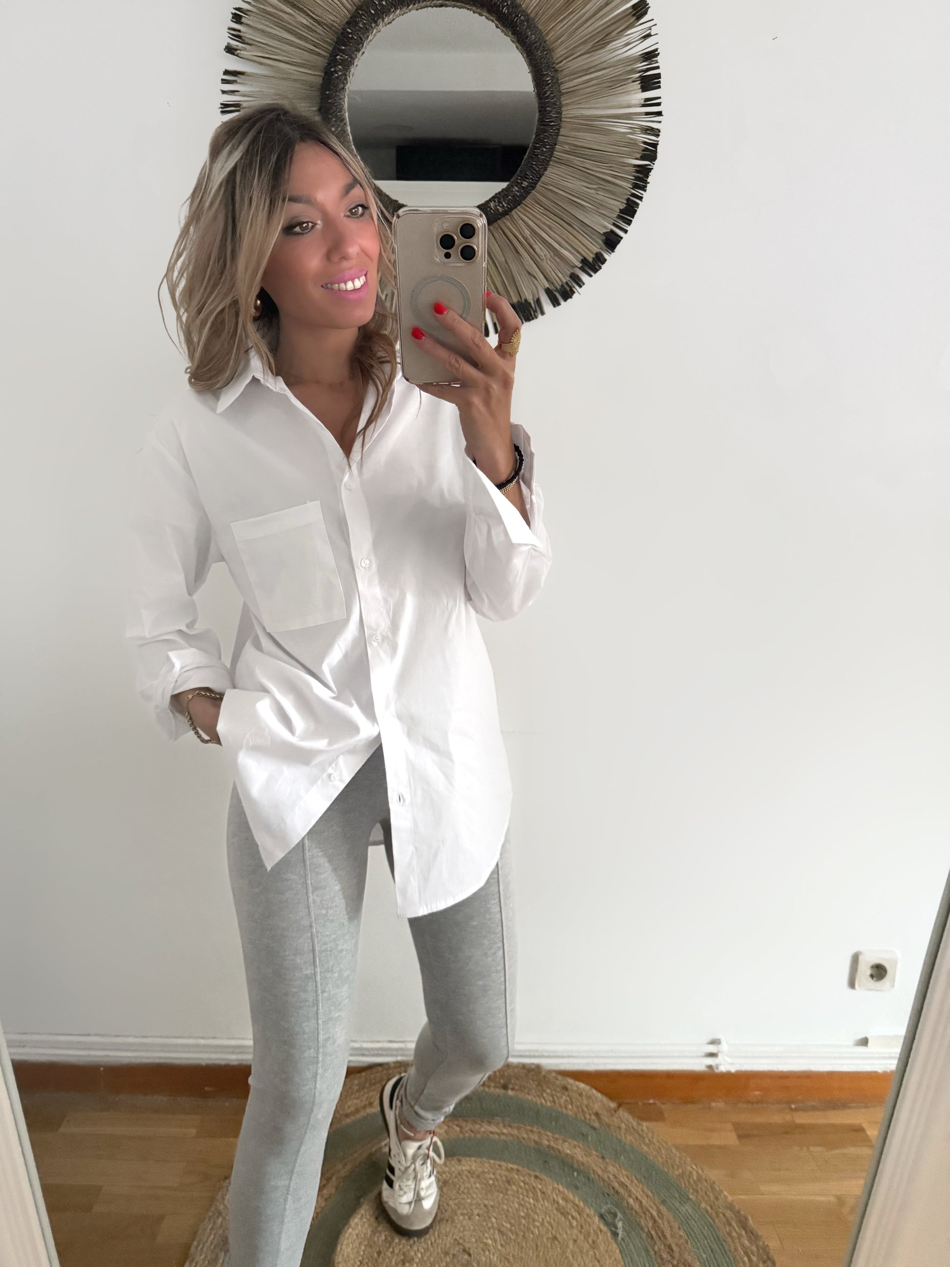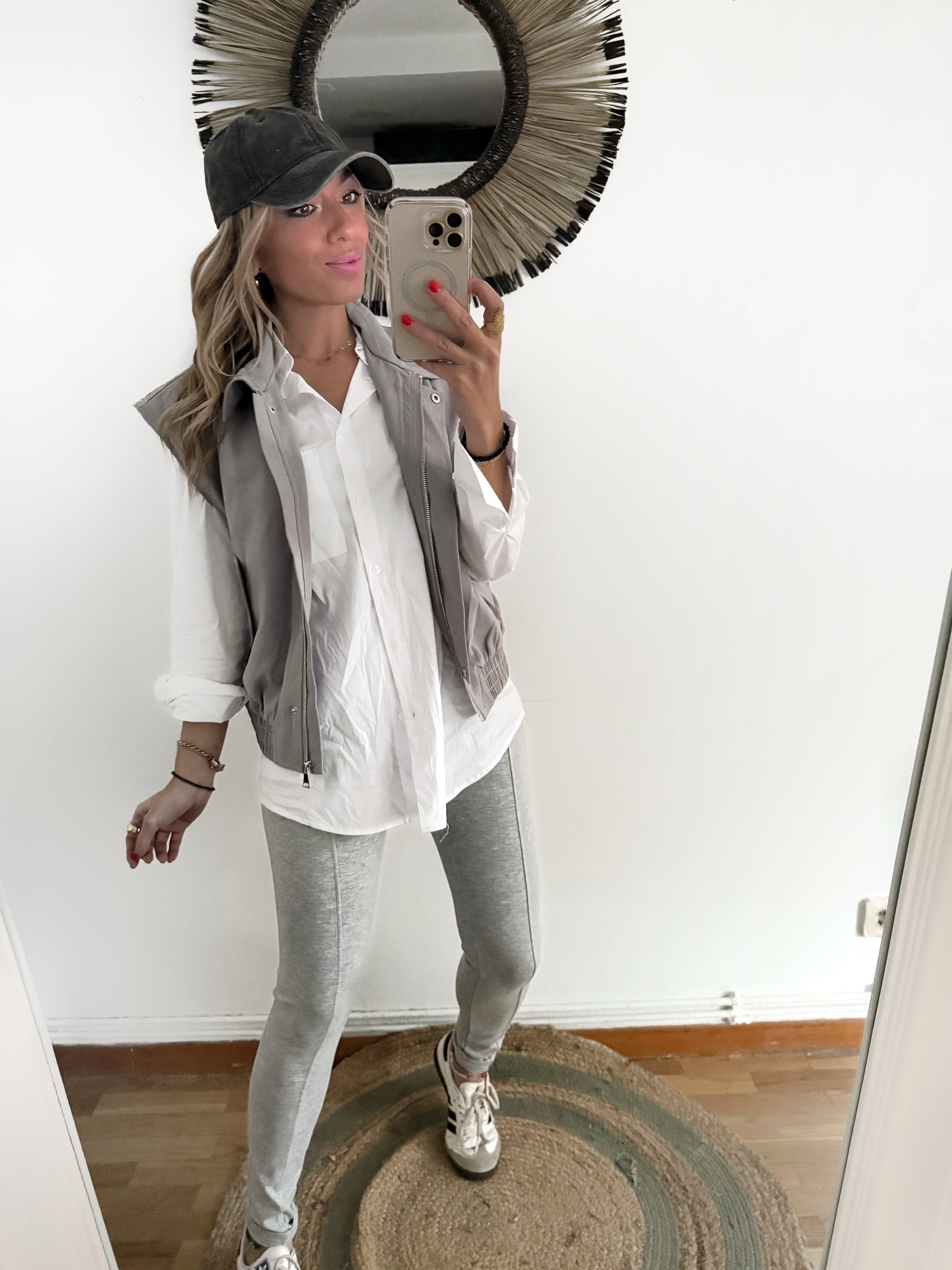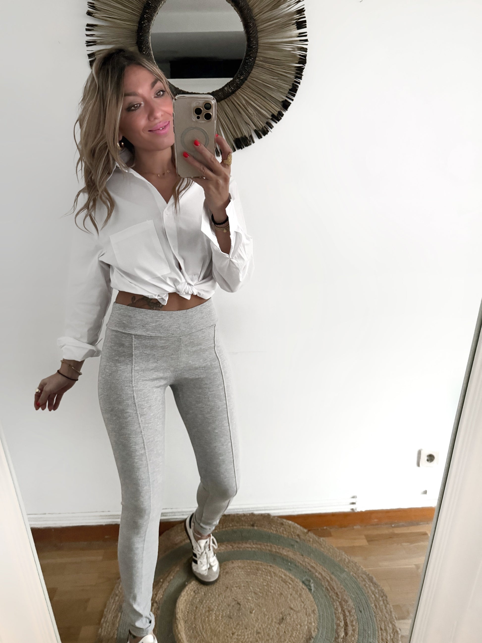 Leggins de algodón en color gris clarito jaspeado. Lleva goma en la cintura, es de tiro medio y pitillo. Tiene cintura ancha con goma. Lleva costuras en relieve en parte delantera y trasera. Se adapta genial.