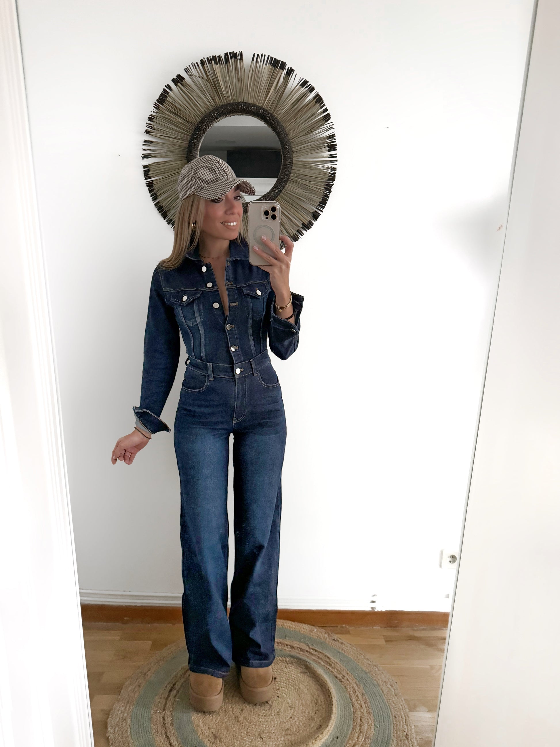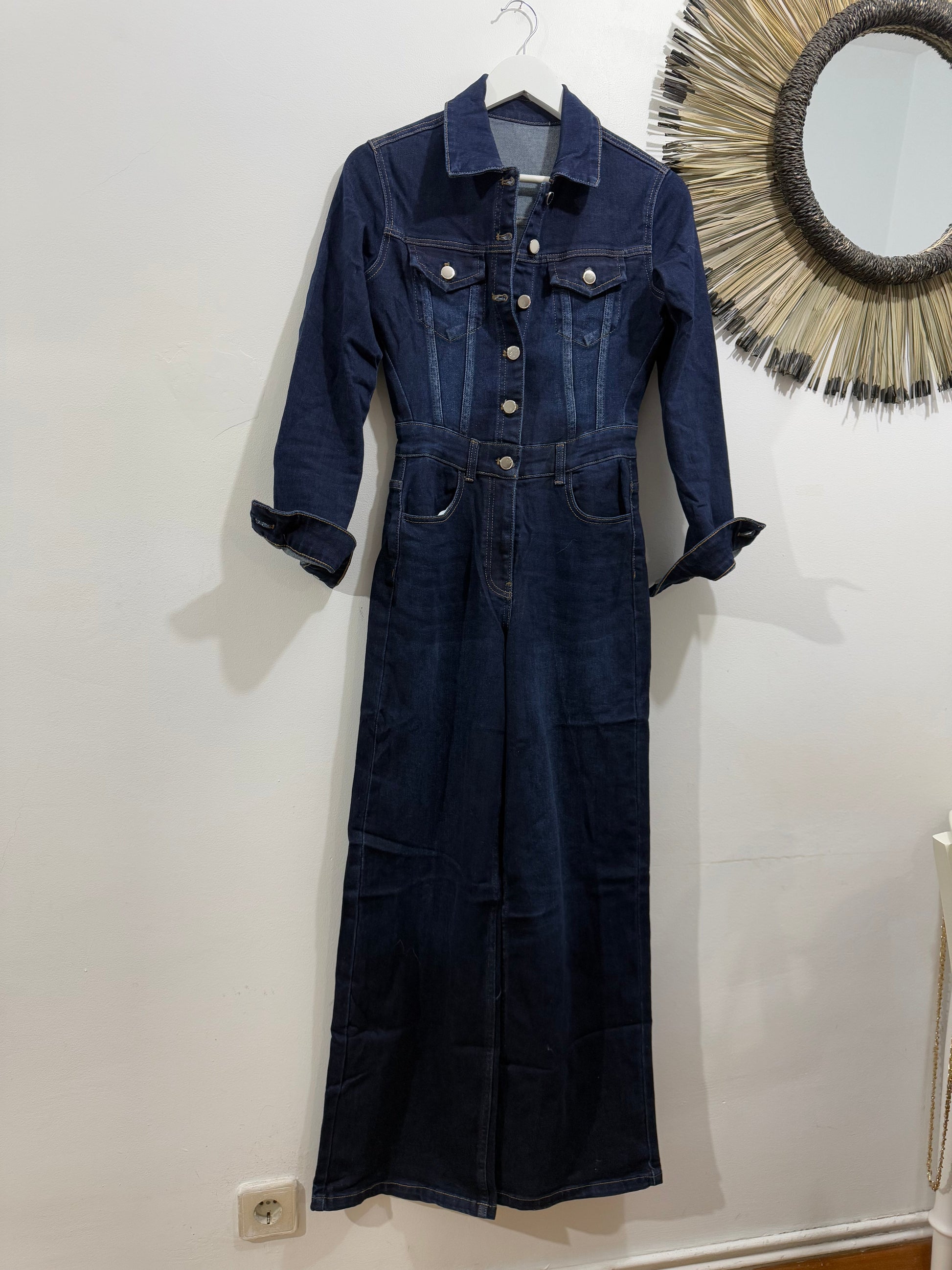 Mono vaquero en tono oscuro. Es elástico y se adapta genial. Abotonado en parte delantera, manga larga. Tiene bolsillos laterales y traseros. Es de corte recto y sienta ideal.
