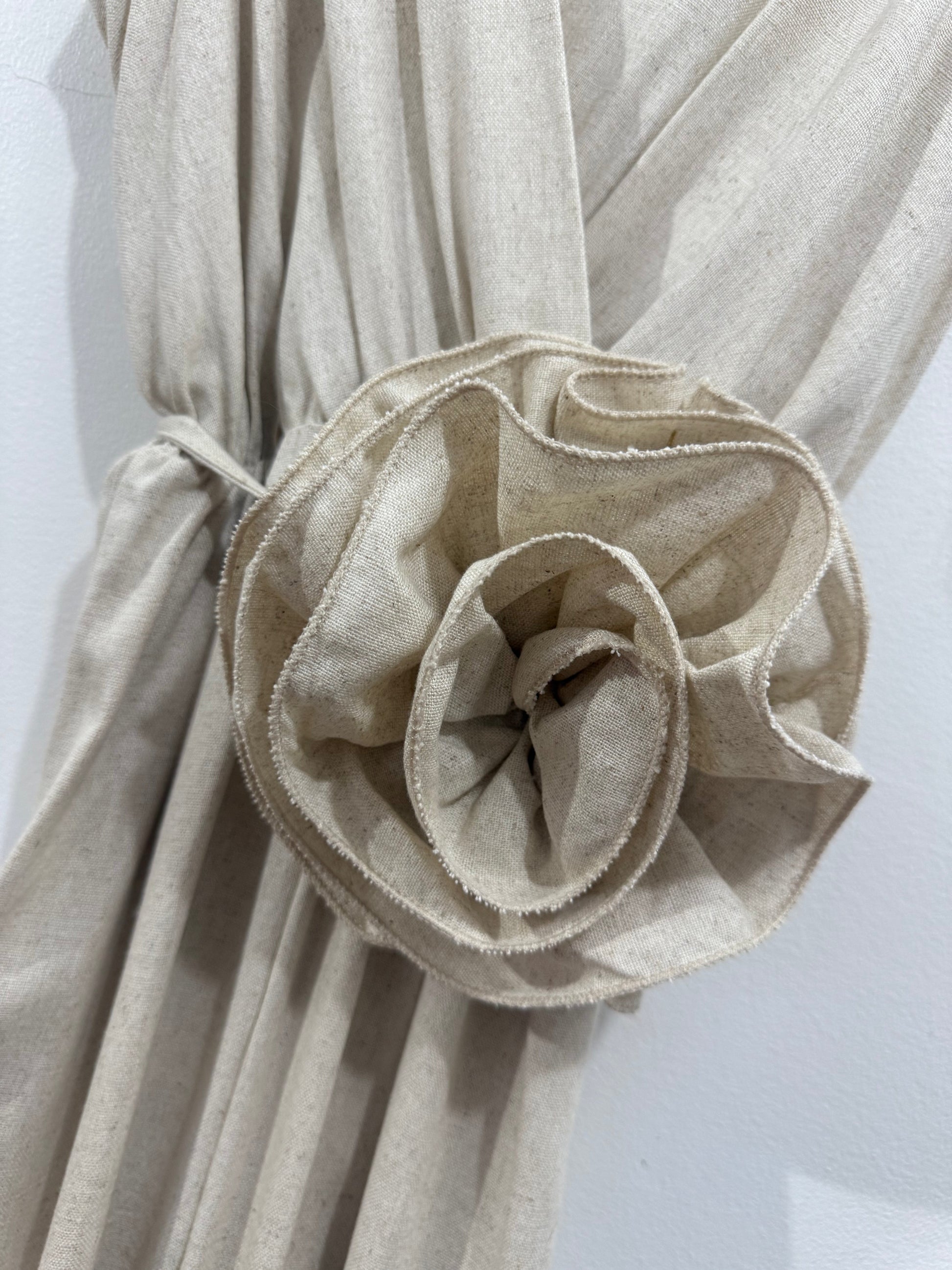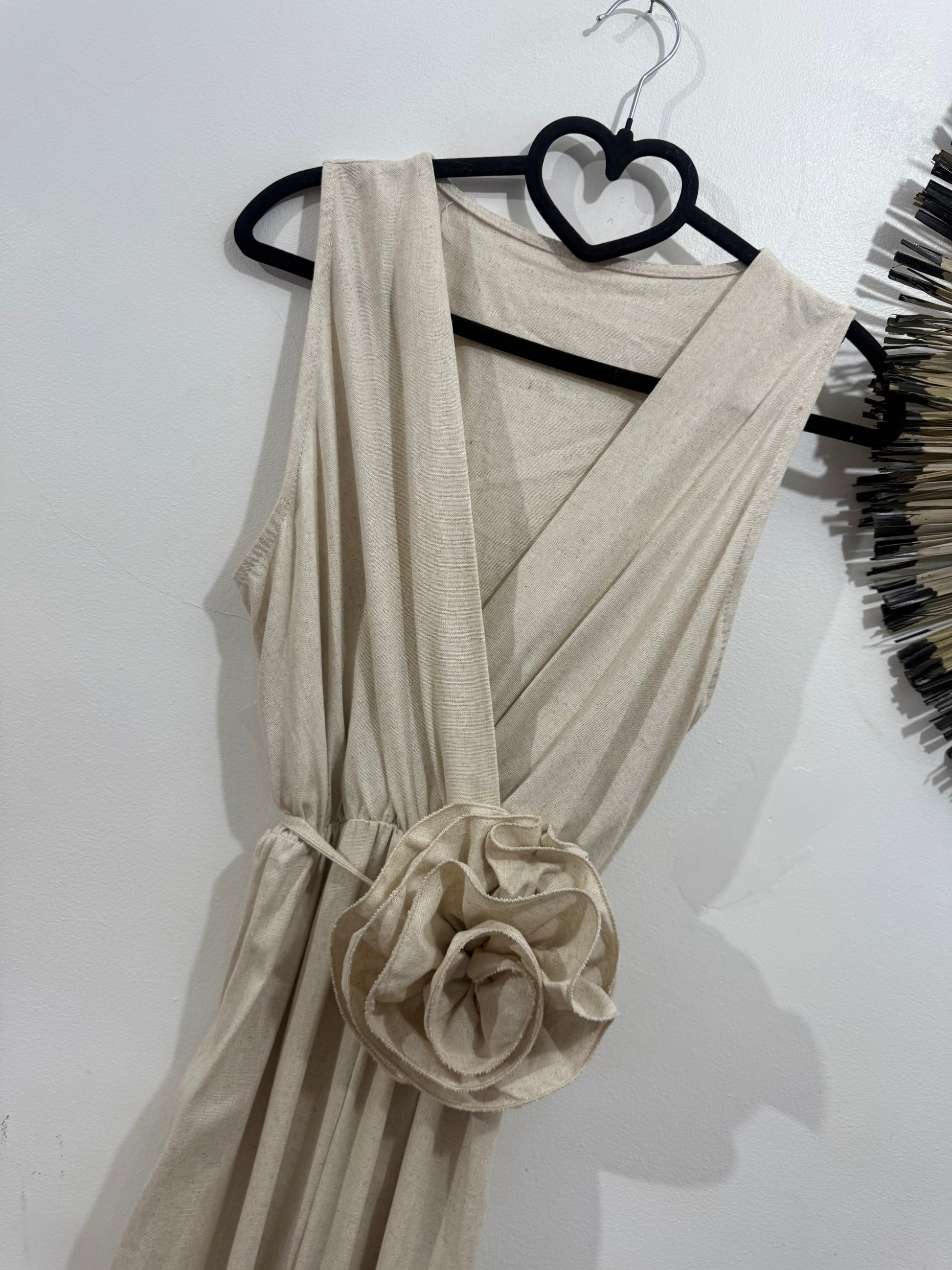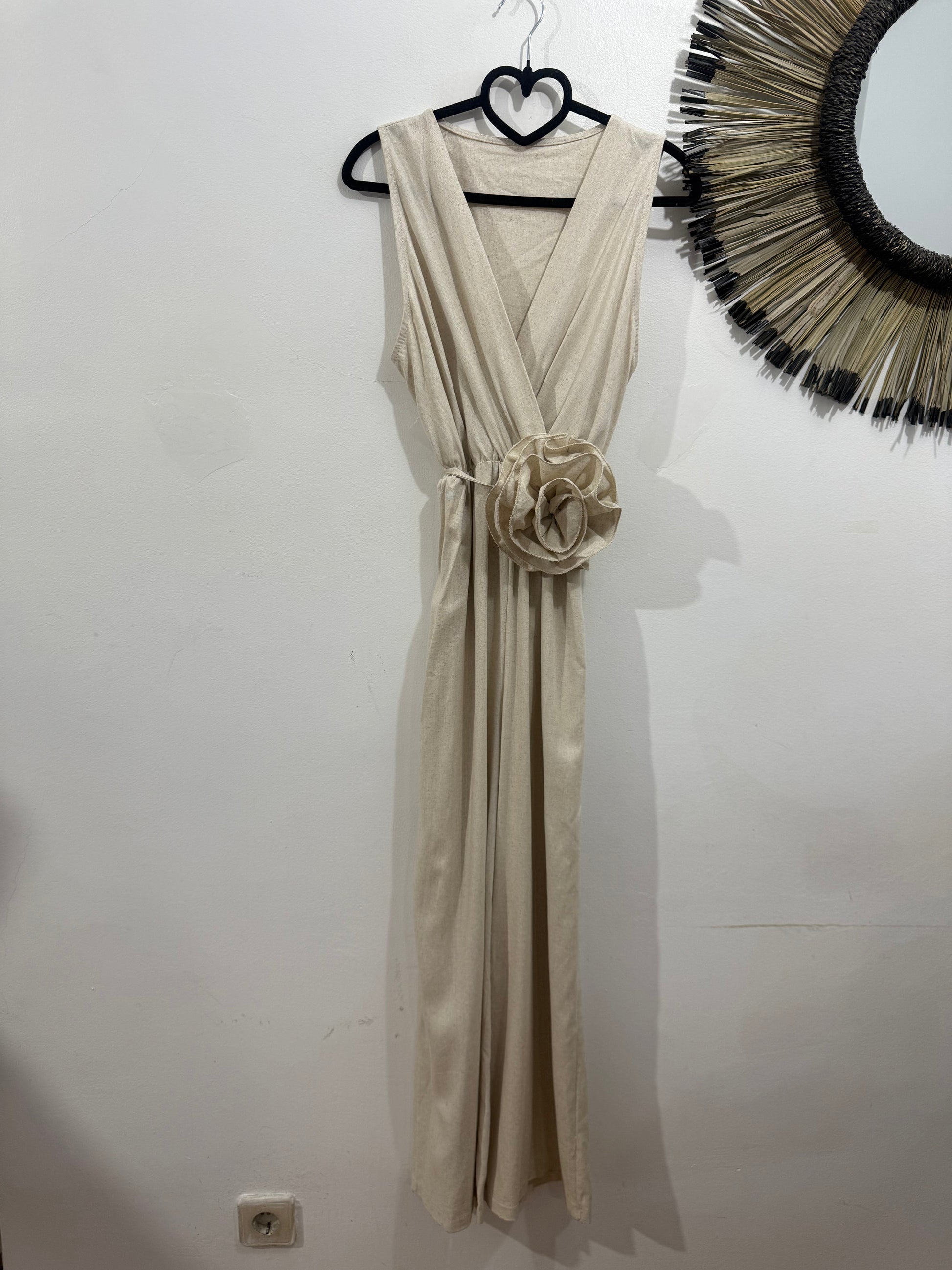 Mono de lino y viscosa en color beige jaspeado. Tiene manga sisa, escote a pico cruzado y goma en la cintura. Es de corte recto. Lleva incluido cinturón con maxi flor de tela en el mismo tono.