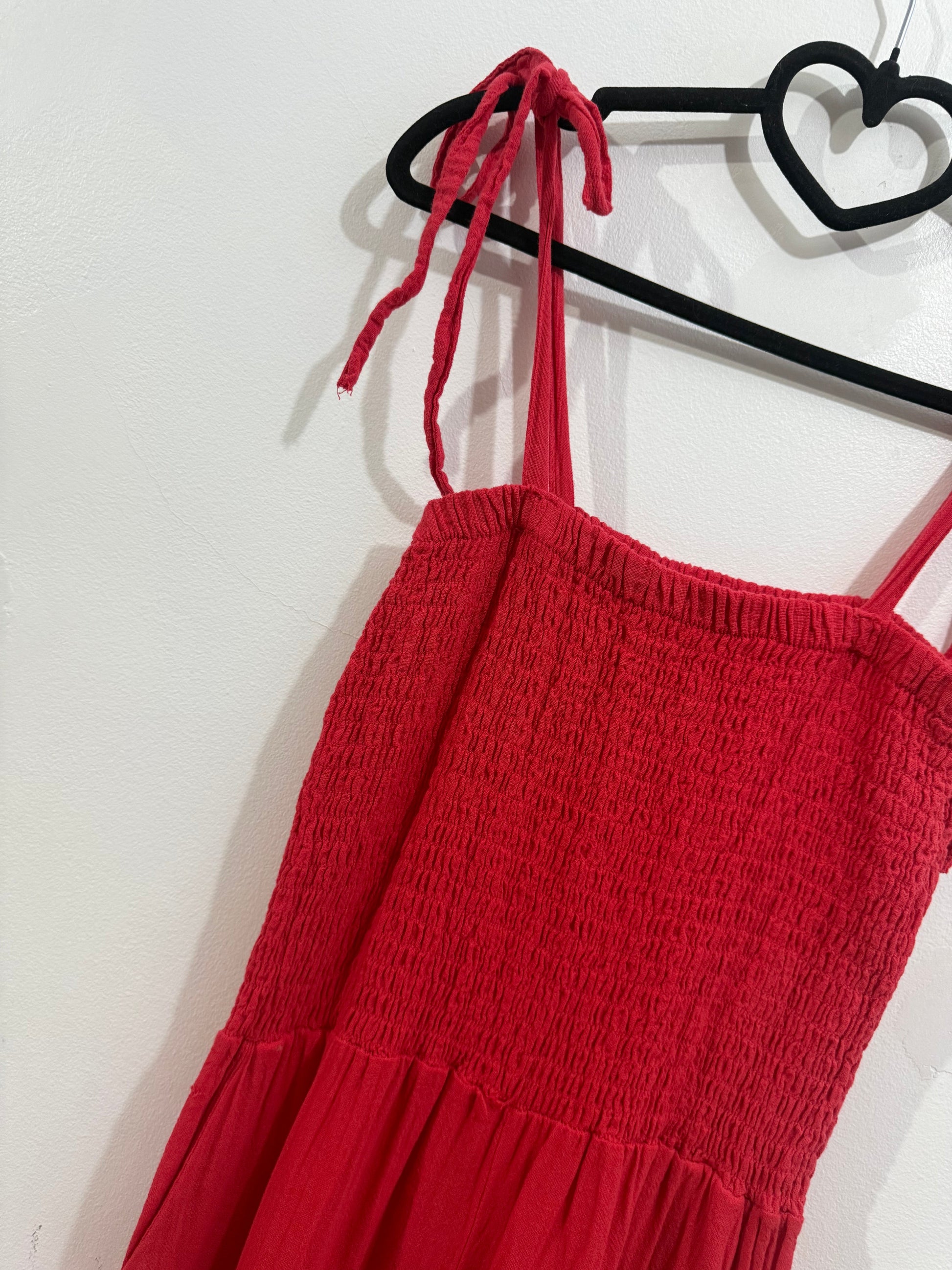 Mono largo de lino y algodón en color rojo. Es súper fresco. Es de tirante fino y tiene nido de abeja en pecho y espalda. Se adapta genial. Es de corte recto con bolsillos laterales y tiene tirantes con lazada para poder regular medida.