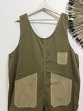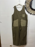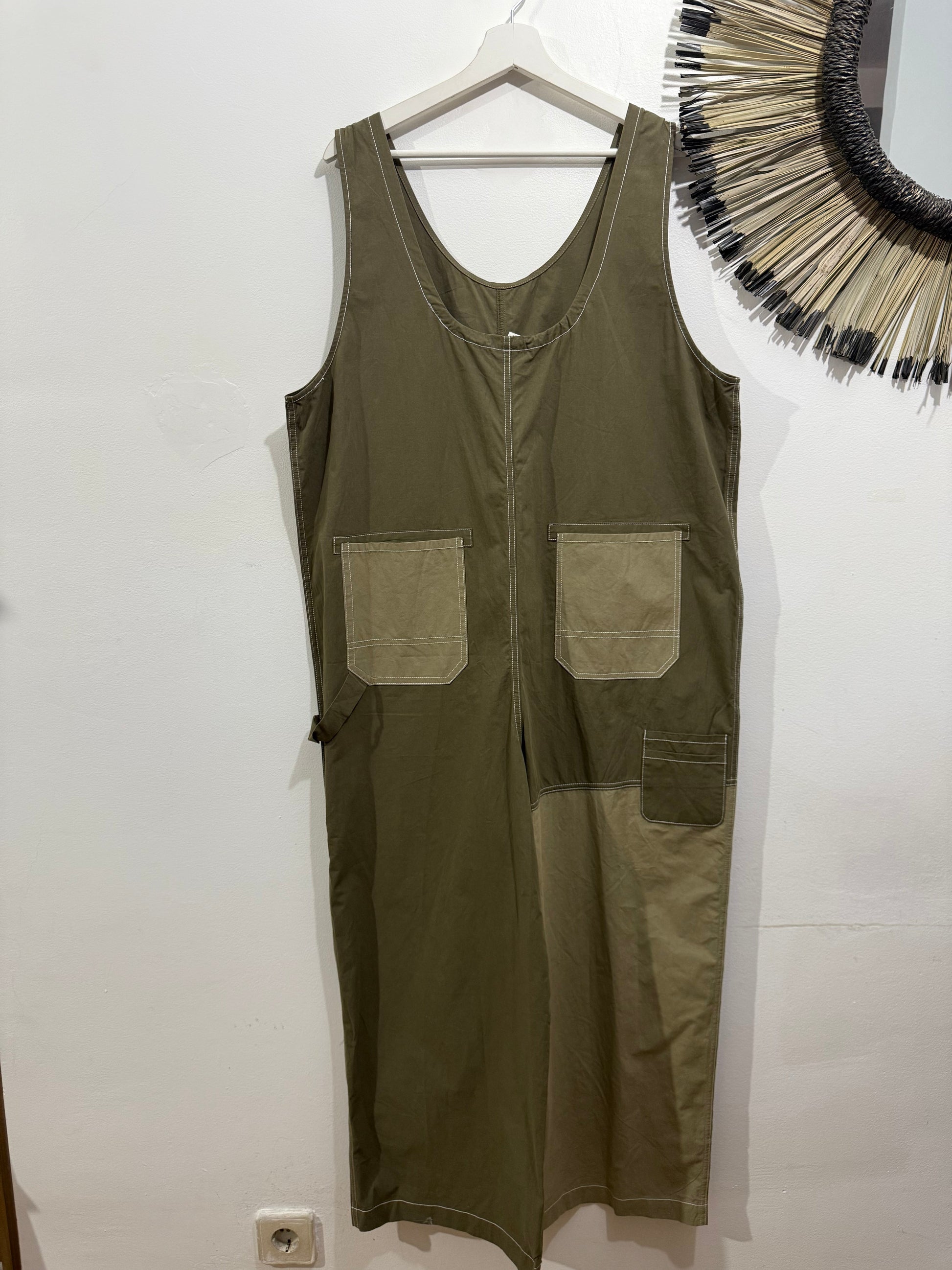 Mono oversize de loneta en color kaki. Es de tirantes y lleva bolsillos en tono más oscuro en parte delantera. Es de corte recto y es bastante amplio.