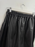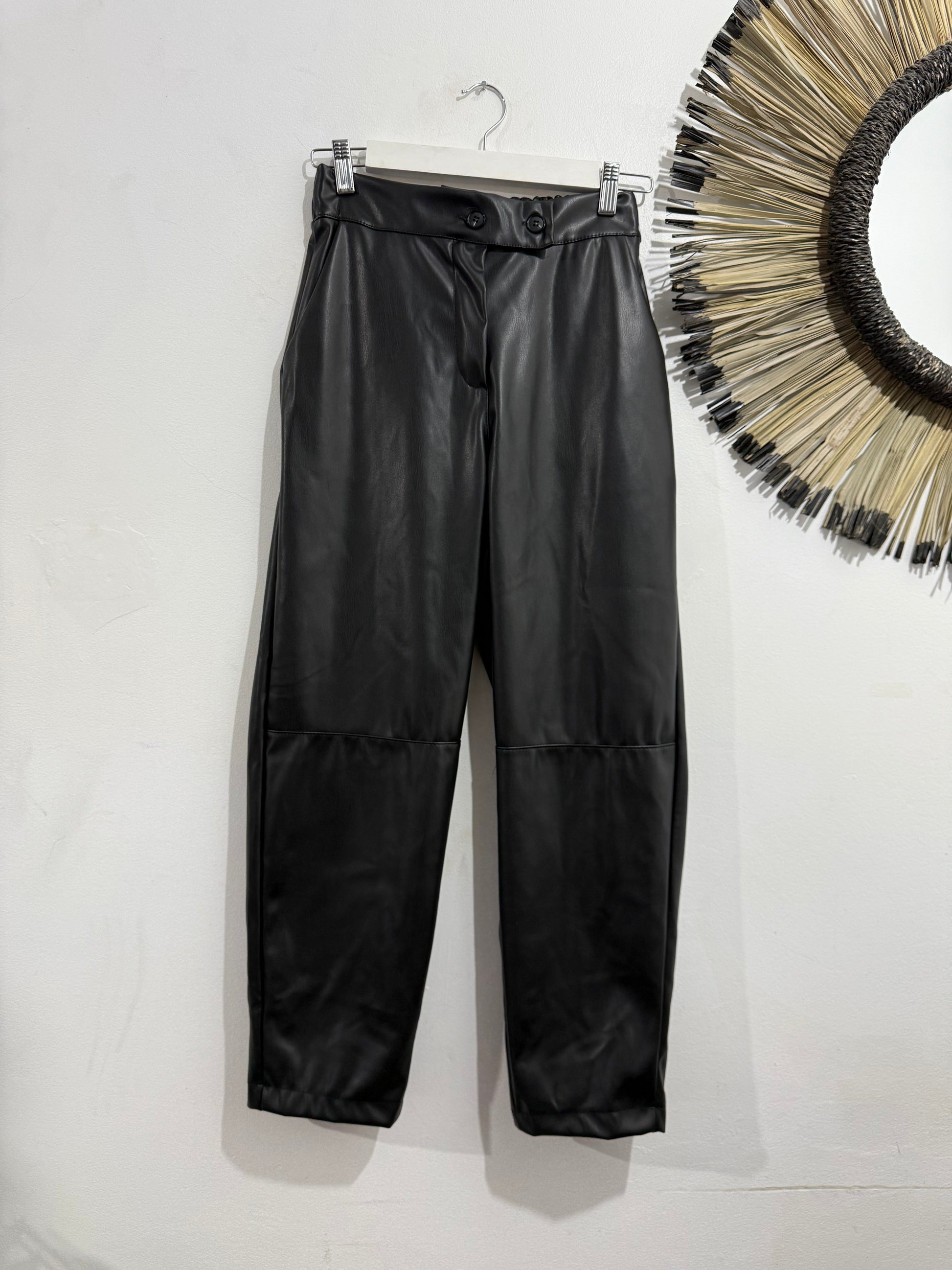 Pantalón de polipiel en color negro. Es de tiro medio/alto. Tiene goma en la cintura en la parte de atrás y botones en parte delantera. Bolsillos laterales. Es tobillero.
