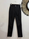 Pantalón pitillo encerado en color negro. Es de tiro medio alto con bolsillos a los laterales. Es elastico.