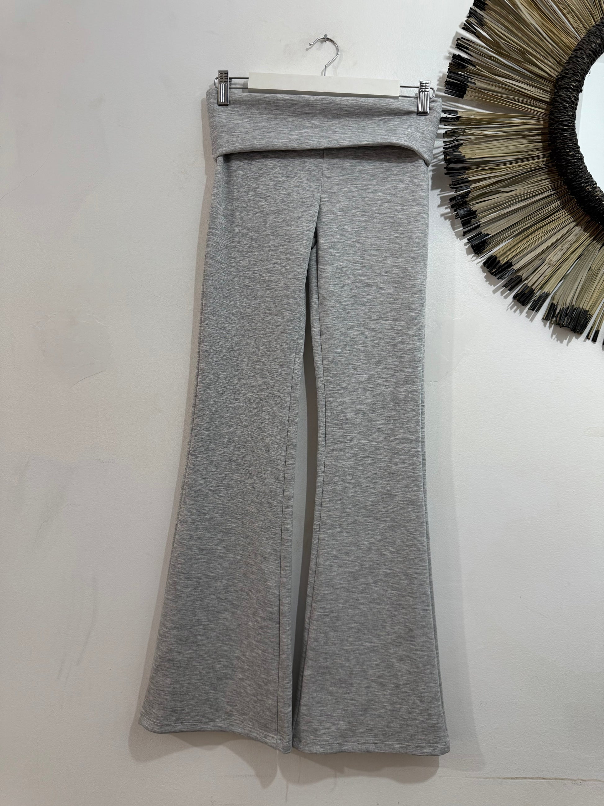 Pantalón de punto frío (tipo neopreno finito) en color gris jaspeado. Es elástico, tiene vuelta en la cinturilla y es pegadito de pierna y termina en una campana muy discreta.