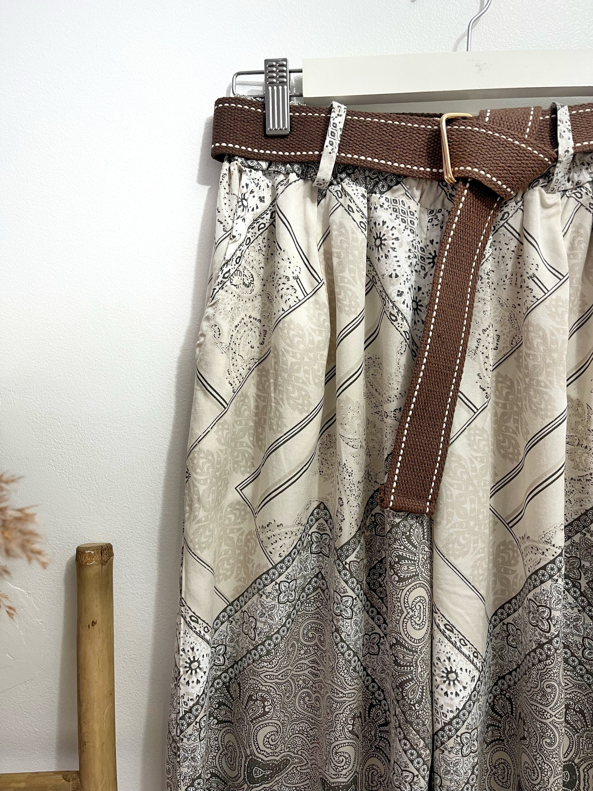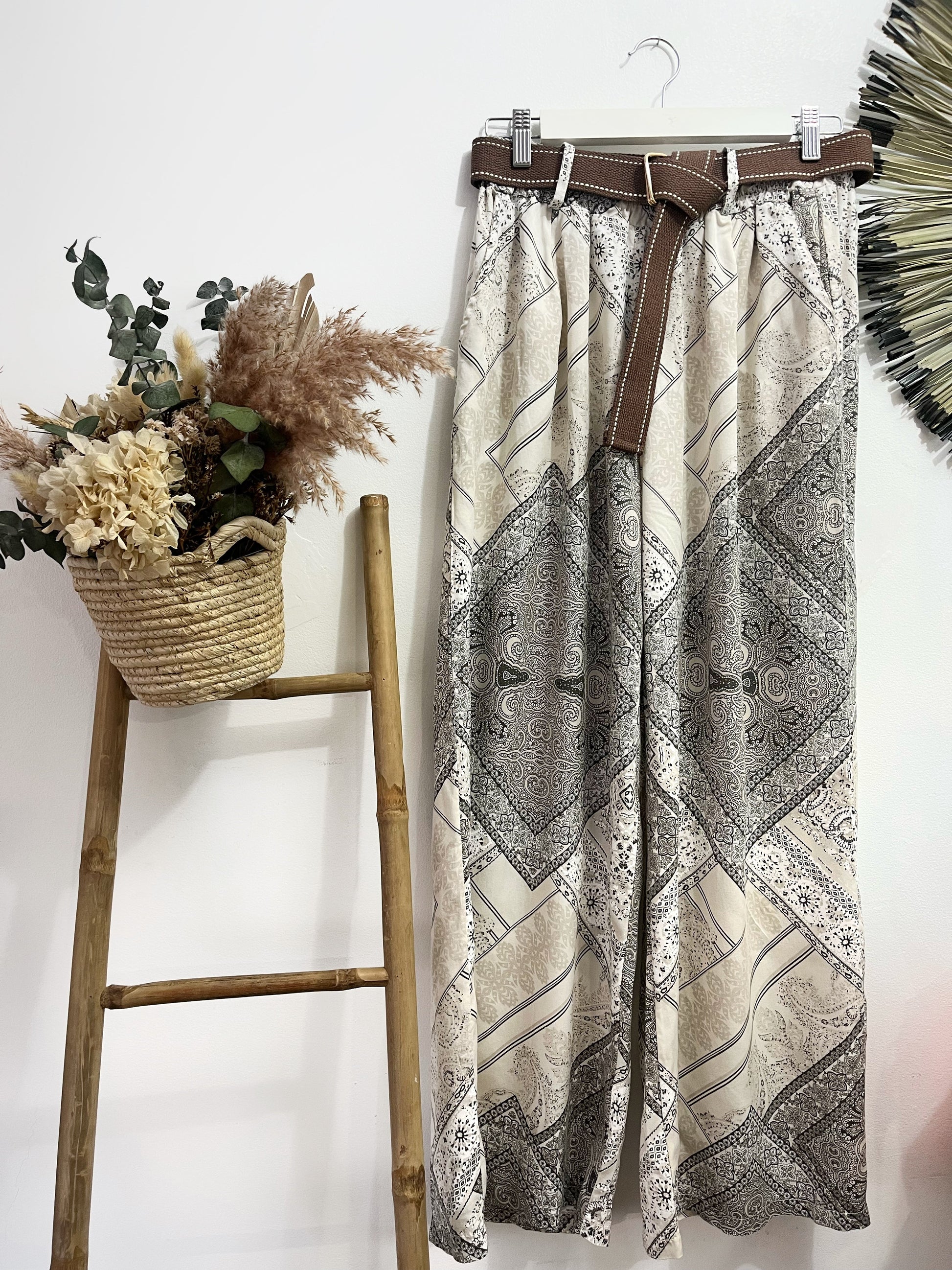 Pantalón de corte recto con estampado paisley en tonos beige y camel. Es súper suelto, fluído y fresco. Lleva goma en la cintura con lo cual se ajusta genial, bolsillos laterales y lleva cinturón marrón incluído.