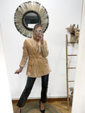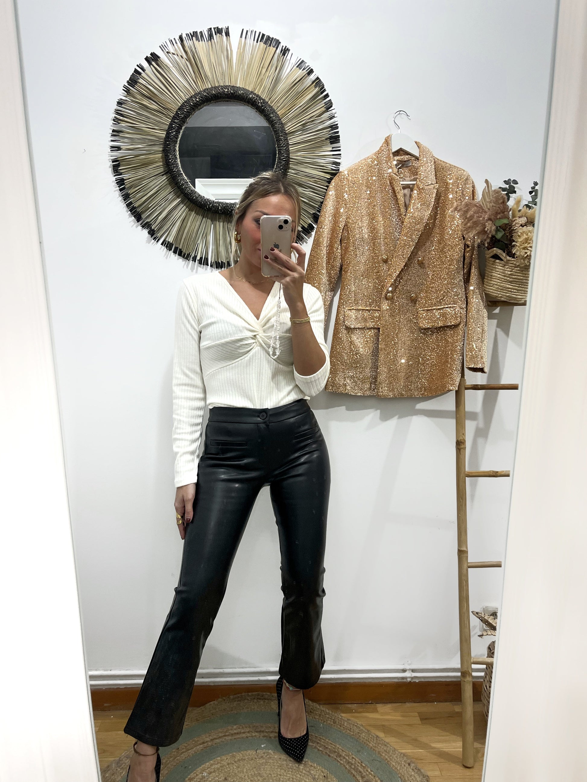 Pantalón de polipiel en color negro. Es de tiro medio/bajo. Cierre con botón en parte delantera. Se adapta genial, es pegadito de pierna, tobillero y termina en campana muy sutil.