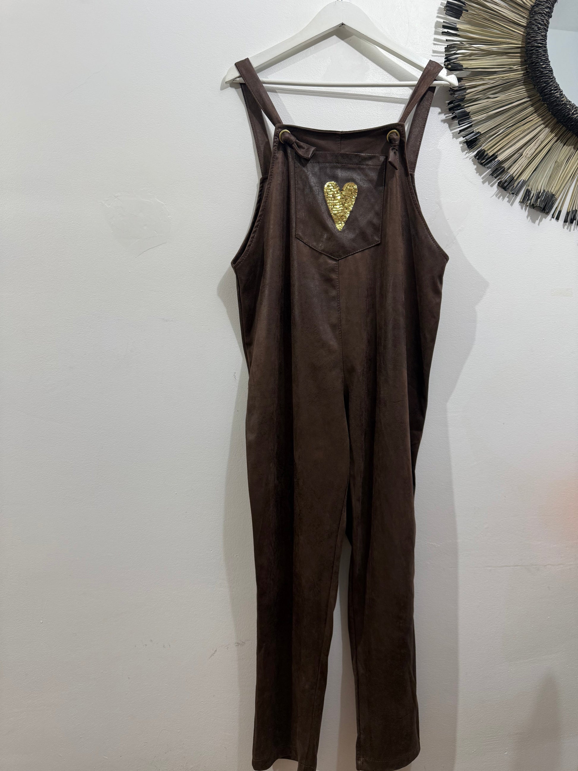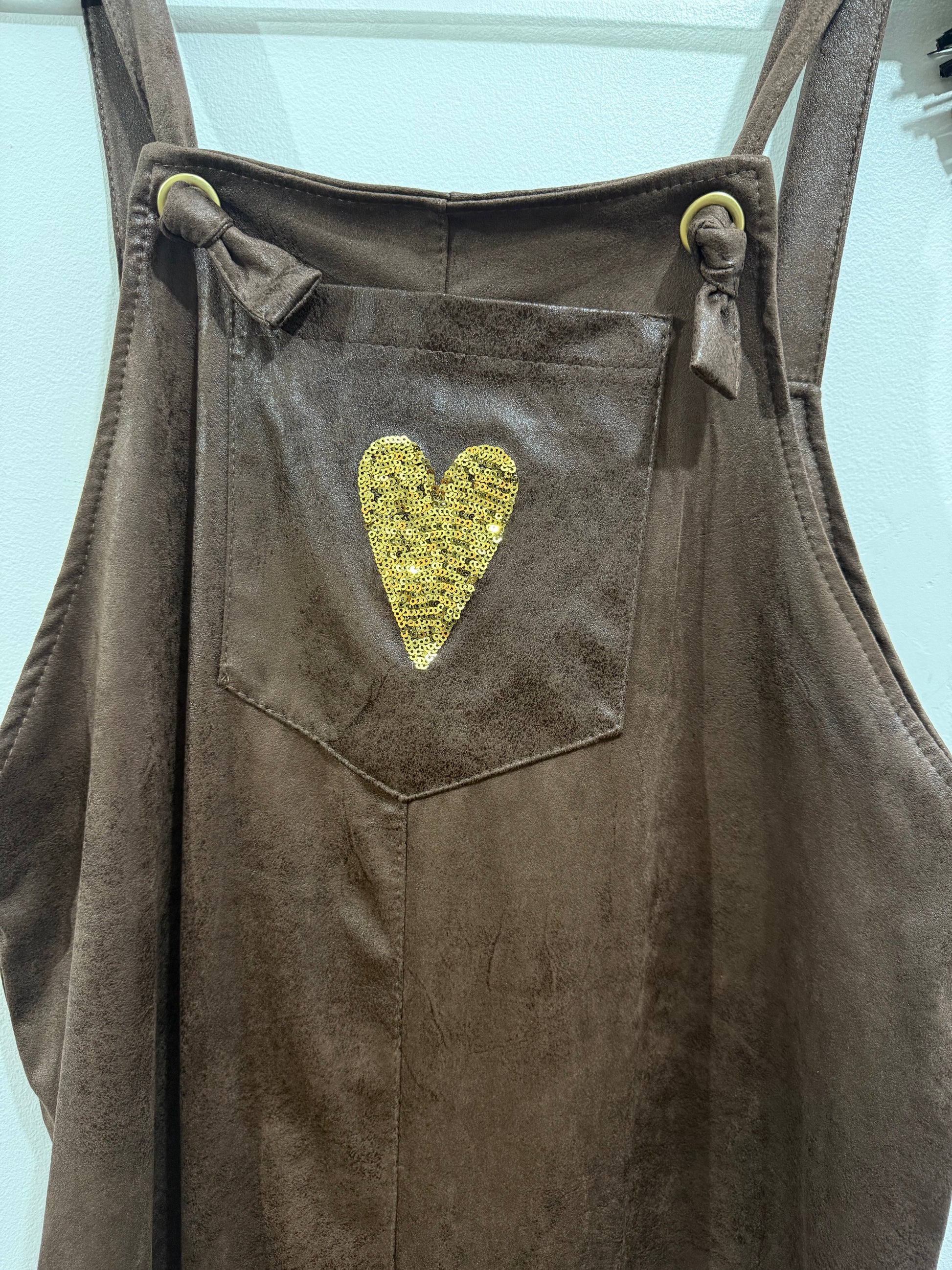 Peto de antelina encerada en color marrón chocolate desgastado. Tienen un corazón de lentejuelas doradas en parte central. Es baggy y los tirantes se pueden regular con nudo en parte delantera. El tejido es súper fluído y sueltecito.