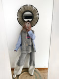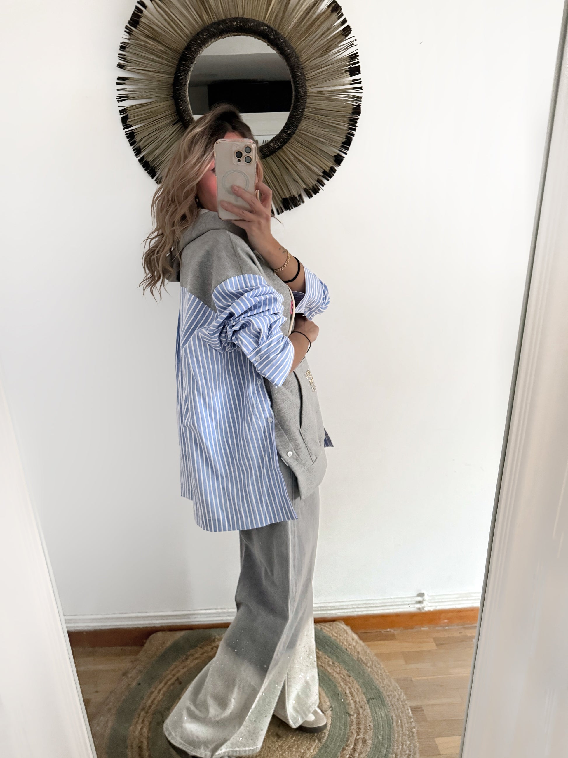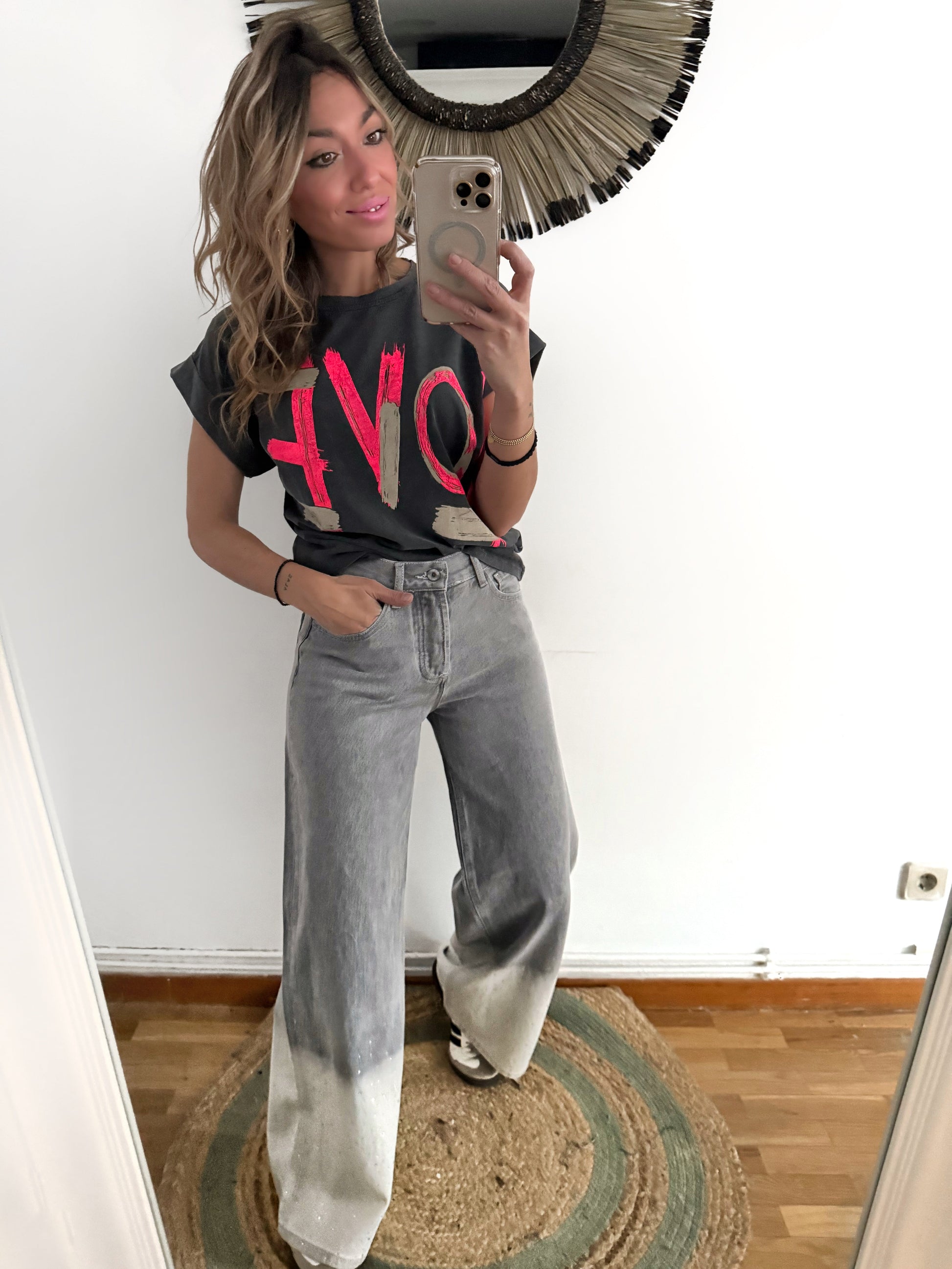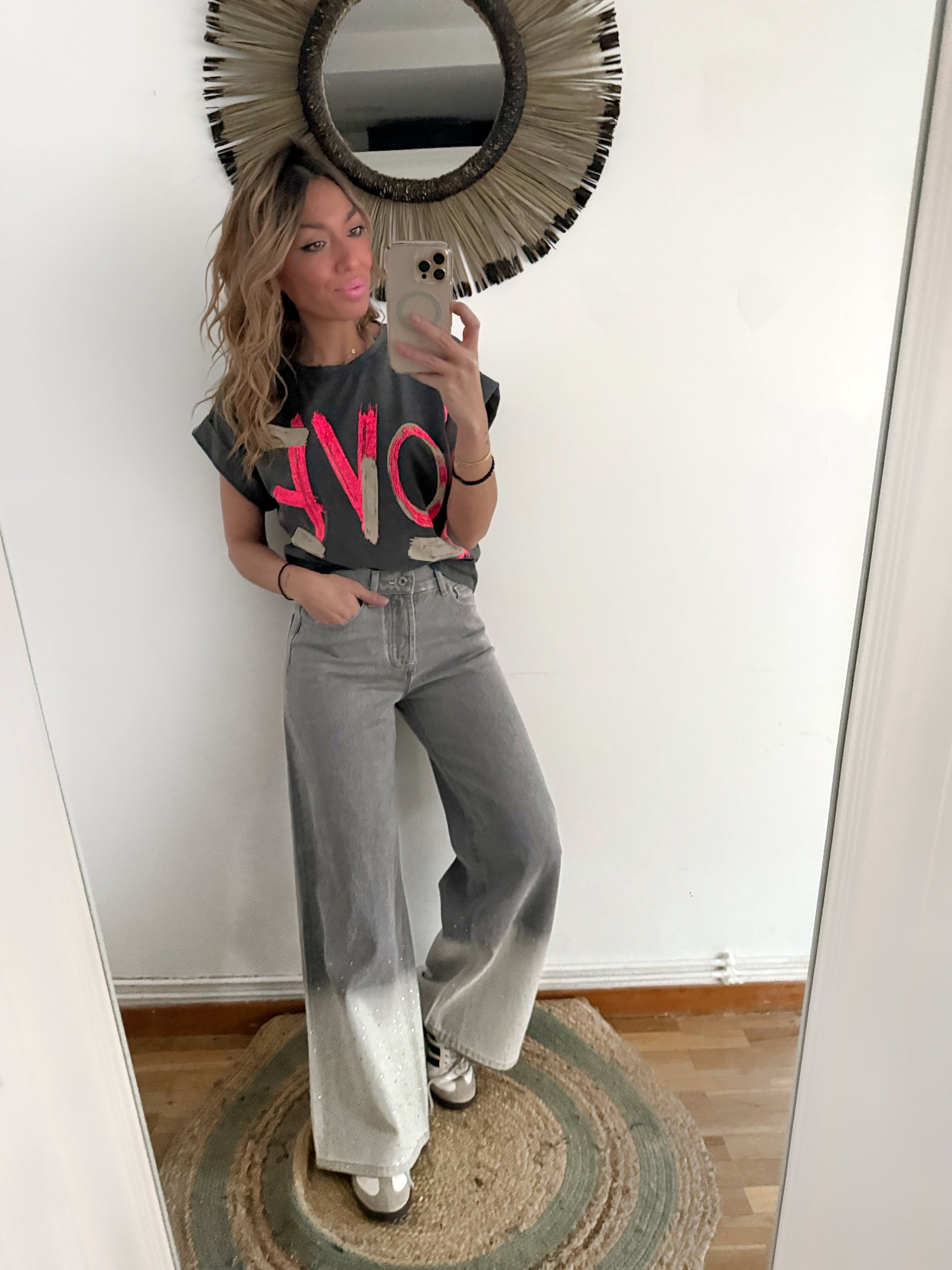 Vaquero en color gris con el bajo Tie Dye en color blanco. El bajo lleva Strass plateado. Es de tiro medio y de corte recto. No tiene elastano. Tiene bolsillos en parte delantera y trasera. Sienta ideal.
