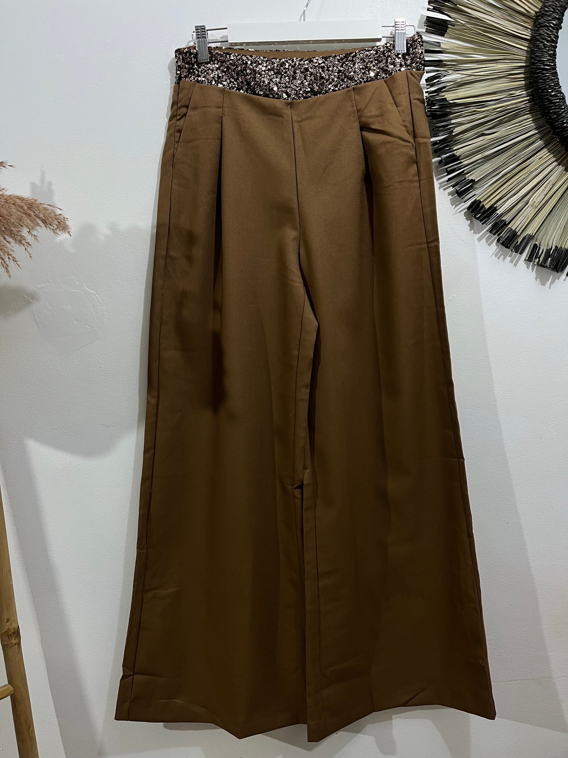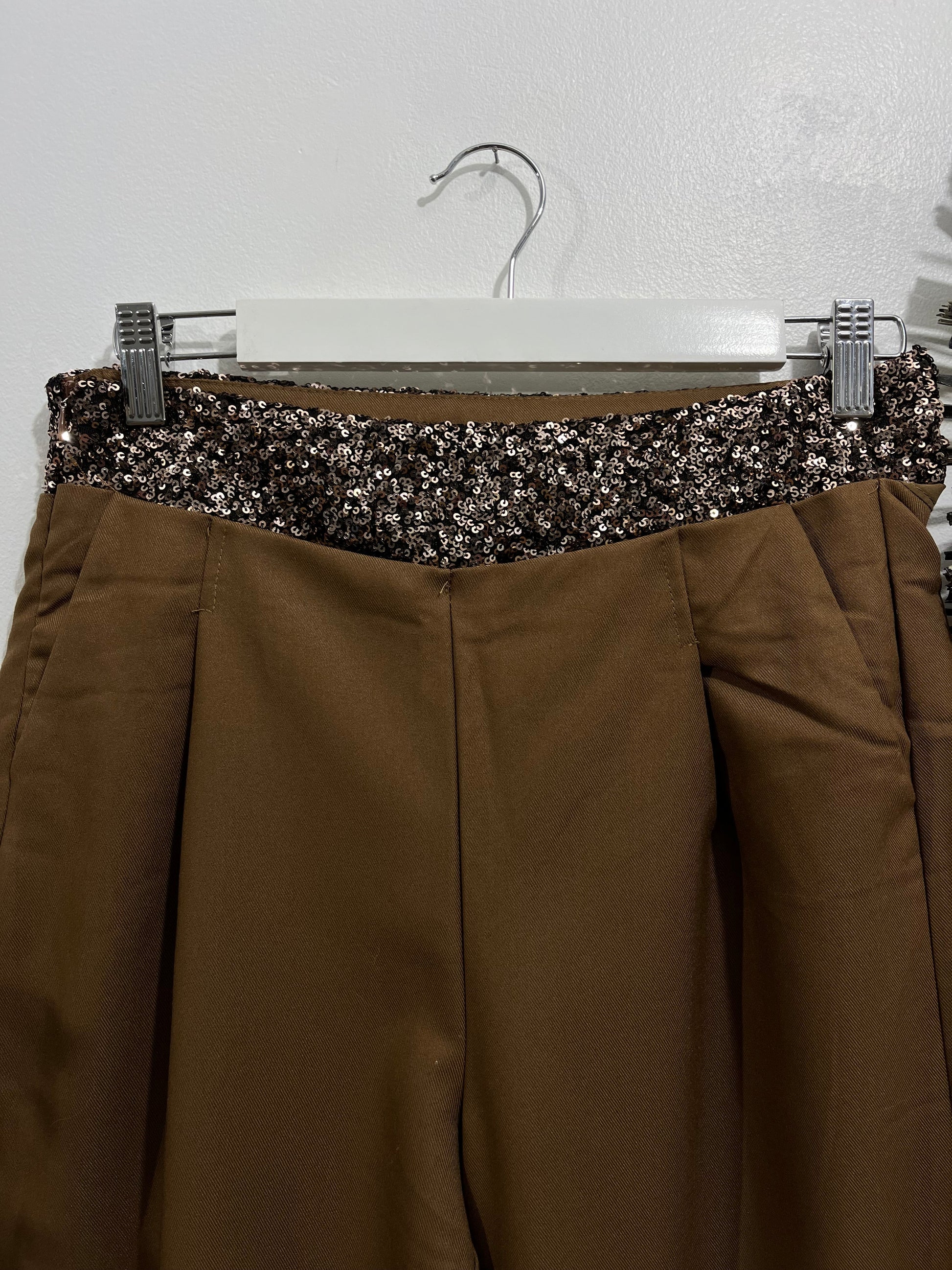 Pantalón de pinzas y corte recto en color marrón. Tiene bolsillos laterales , falsos bolsillos tipo chino en parte trasera y detalle de franja de lentejuelas marrones en la cintura. Sienta genial.