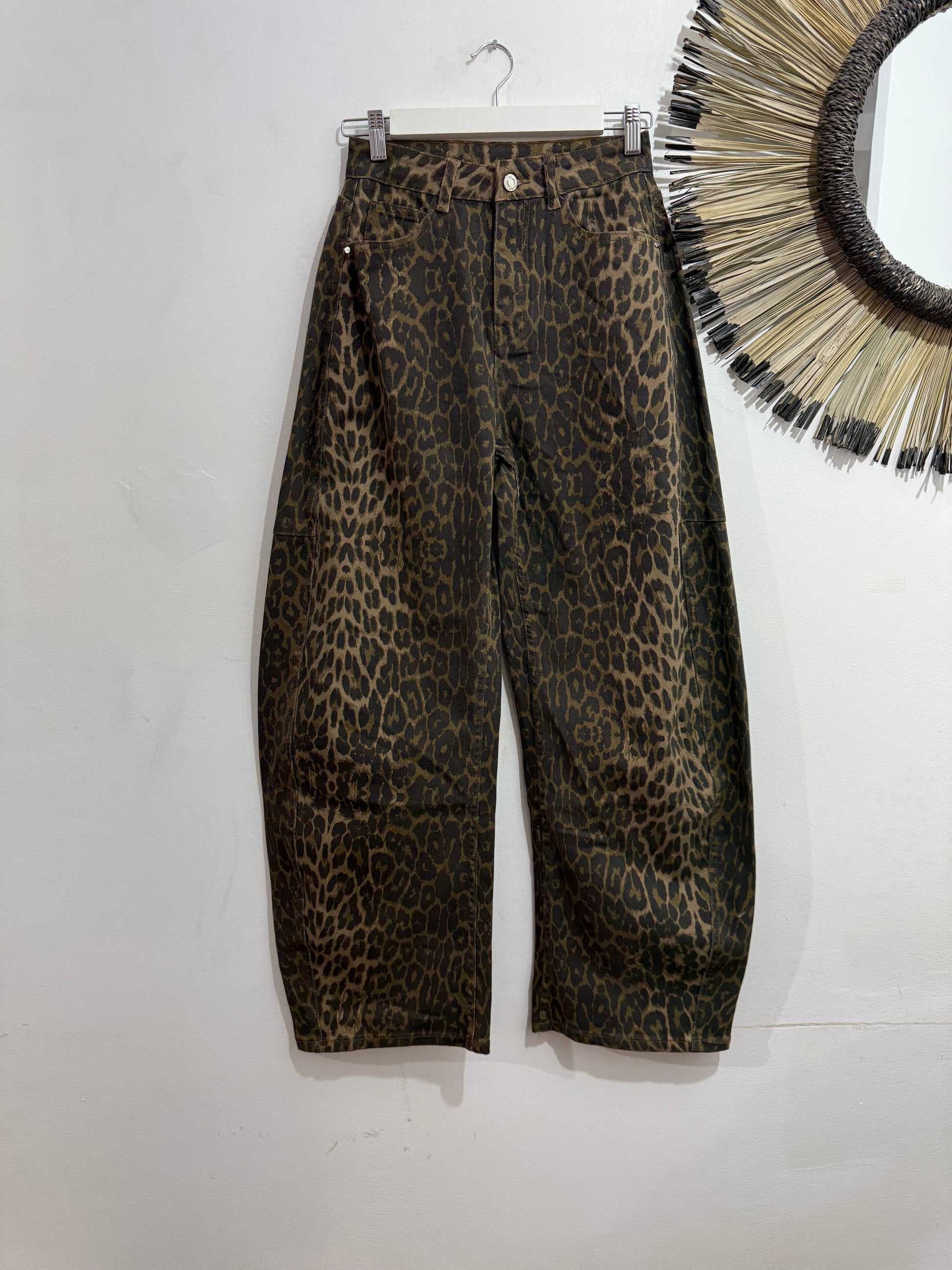 Vaquero de tipo ballon con estampado animal print. Es elástico y de tiro medio alto. Tiene bolsillos en parte delantera y trasera.