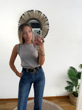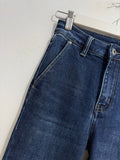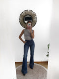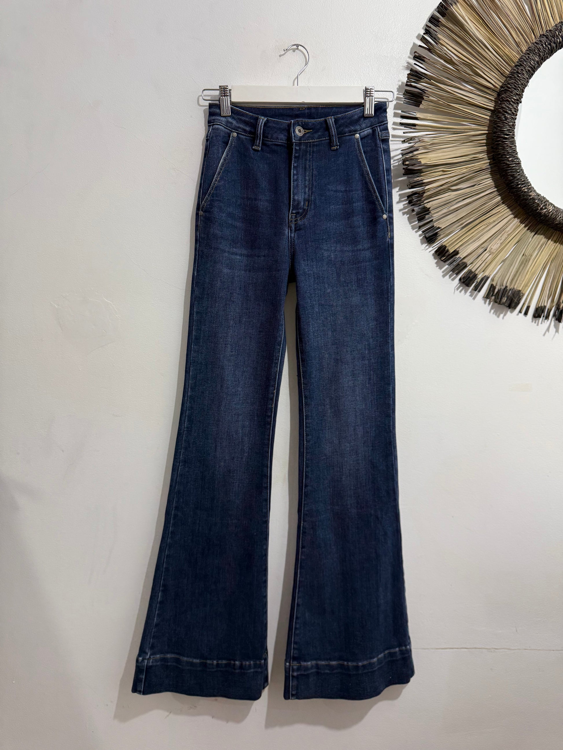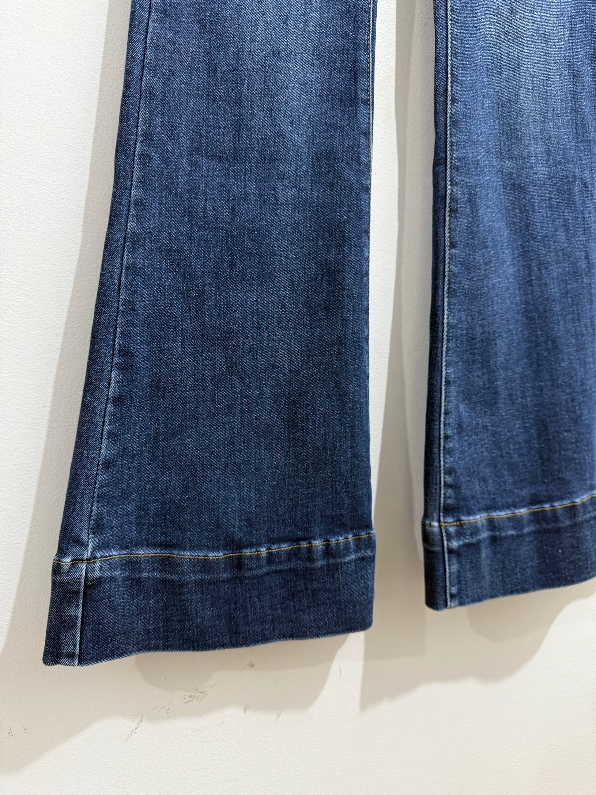 Vaquero elástico en tono medio/oscuro con partes más claras. Es de tiro medio y sienta genial. Tiene bolsillos laterales y en parte trasera. Pegado de pierna y termina en campana. Tiene Maxi bajo.