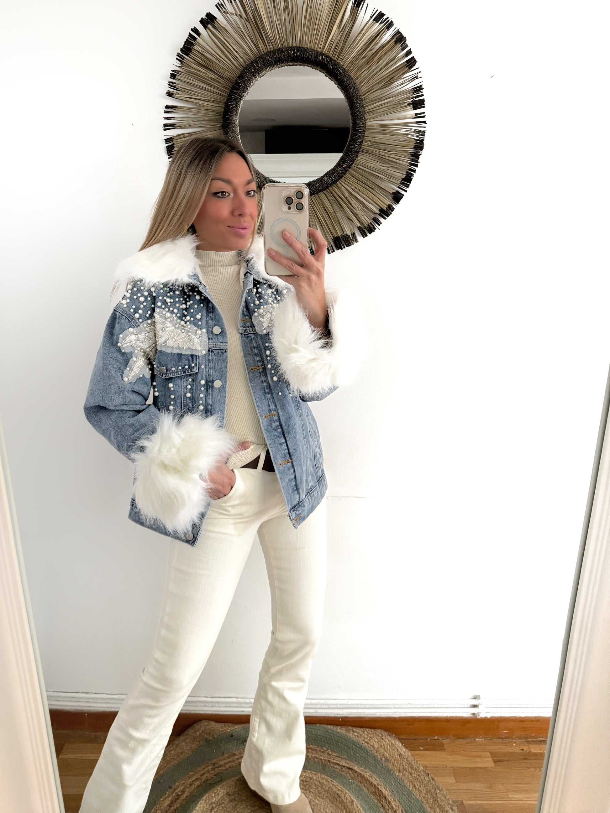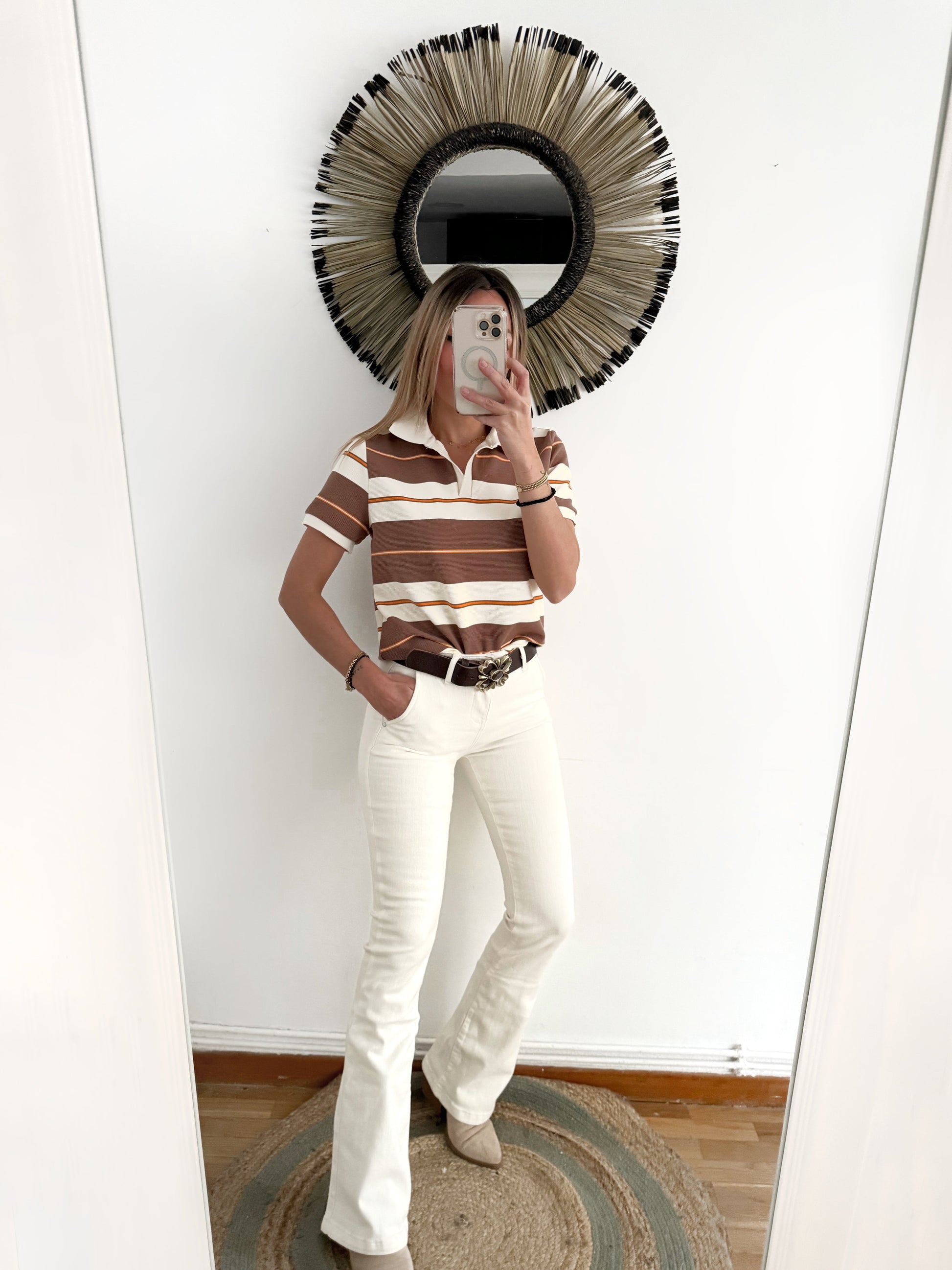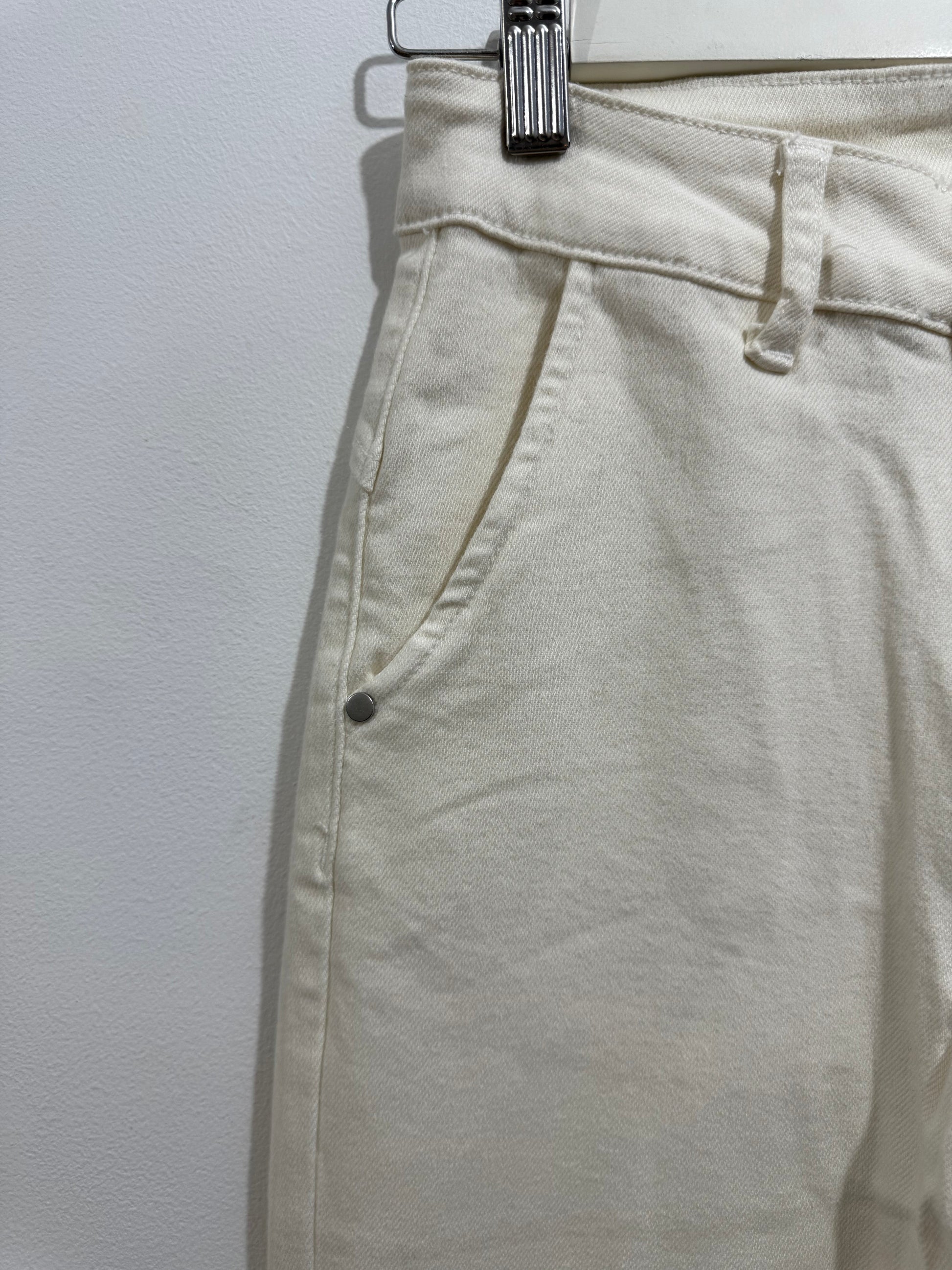 Vaquero elástico en color blanco roto. Es de tiro medio. Es pegado de pierna y termina en una campana muy sutil. Tiene bolsillos en parte delantera y los bolsillos de la parte de atrás son tipo chino. Es push up, elástico y se adapta genial.