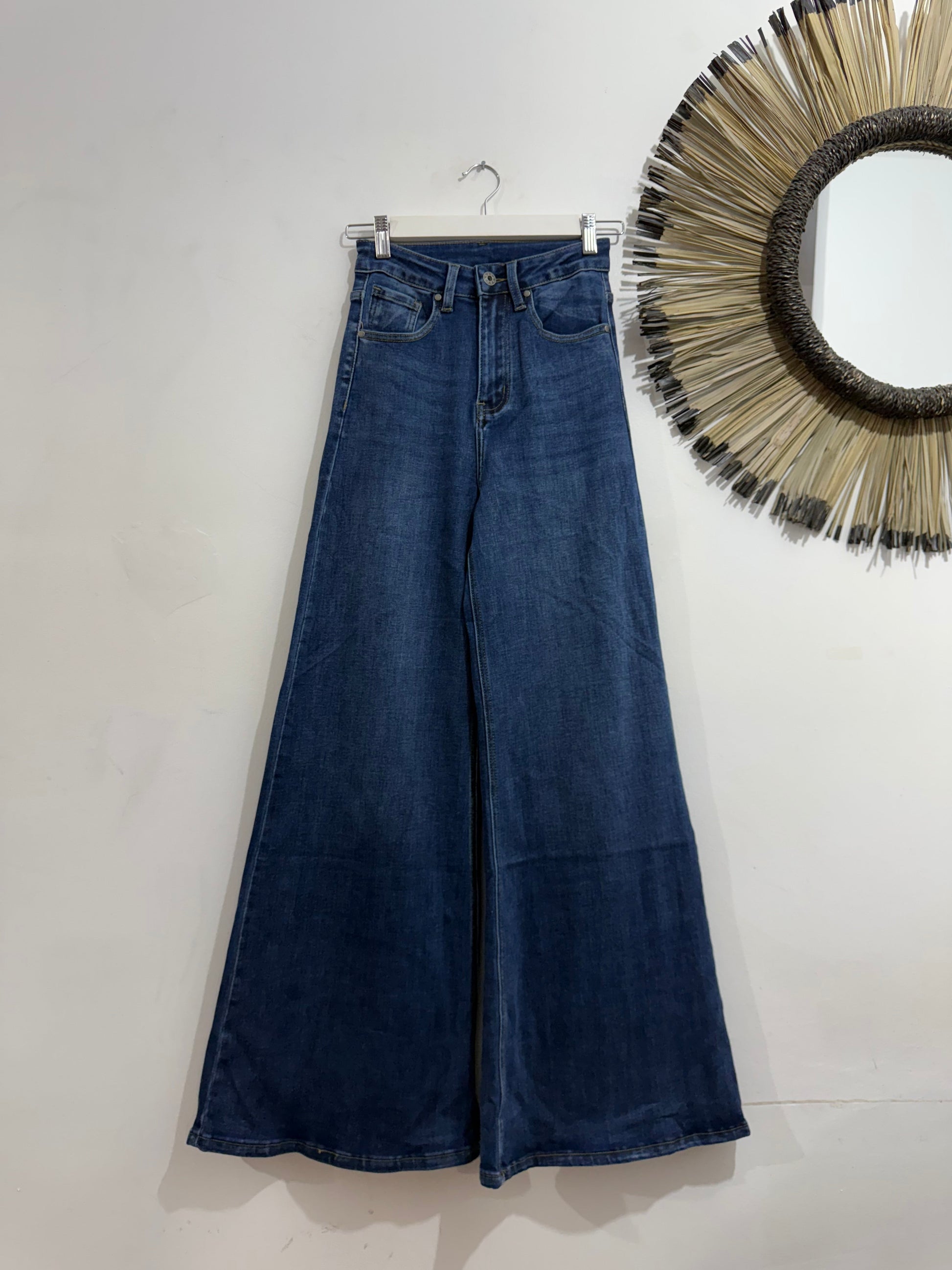 Vaquero en tono oscuro de tiro alto y de pierna con corte Palazzo. Es súper cómodo y tiene elastano. Bolsillos en parte delantera y en parte trasera.
