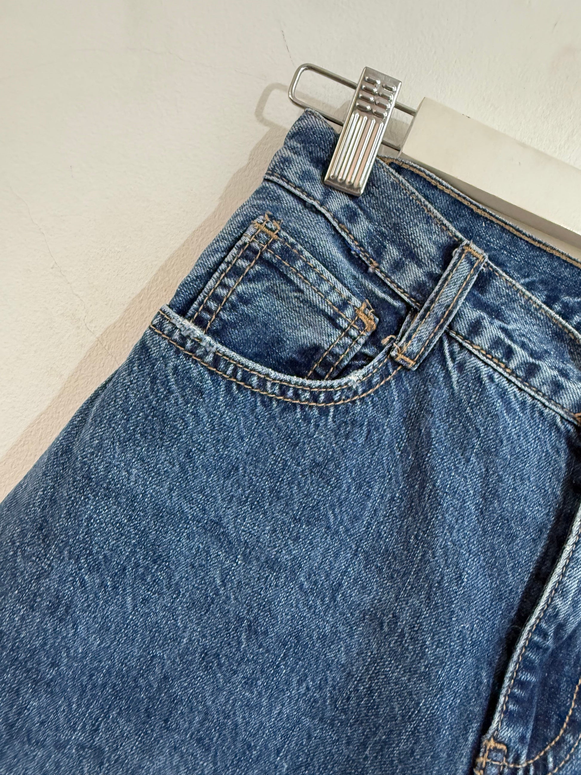 Vaquero sin elastano de corte recto con tachas planas plateadas y negras en el bajo. Es tobillero y de tiro medio. Tiene bolsillos en parte delantera y trasera.