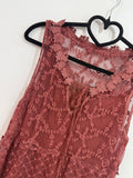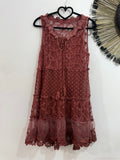 Vestido de encaje y crochet en color teja. Es de manga tipo sosa y lleva franjas de tul; encaje y crochet. Lleva abertura con cordones en el escote y tiene incluido vestido interior de tirantes en el mismo tono.