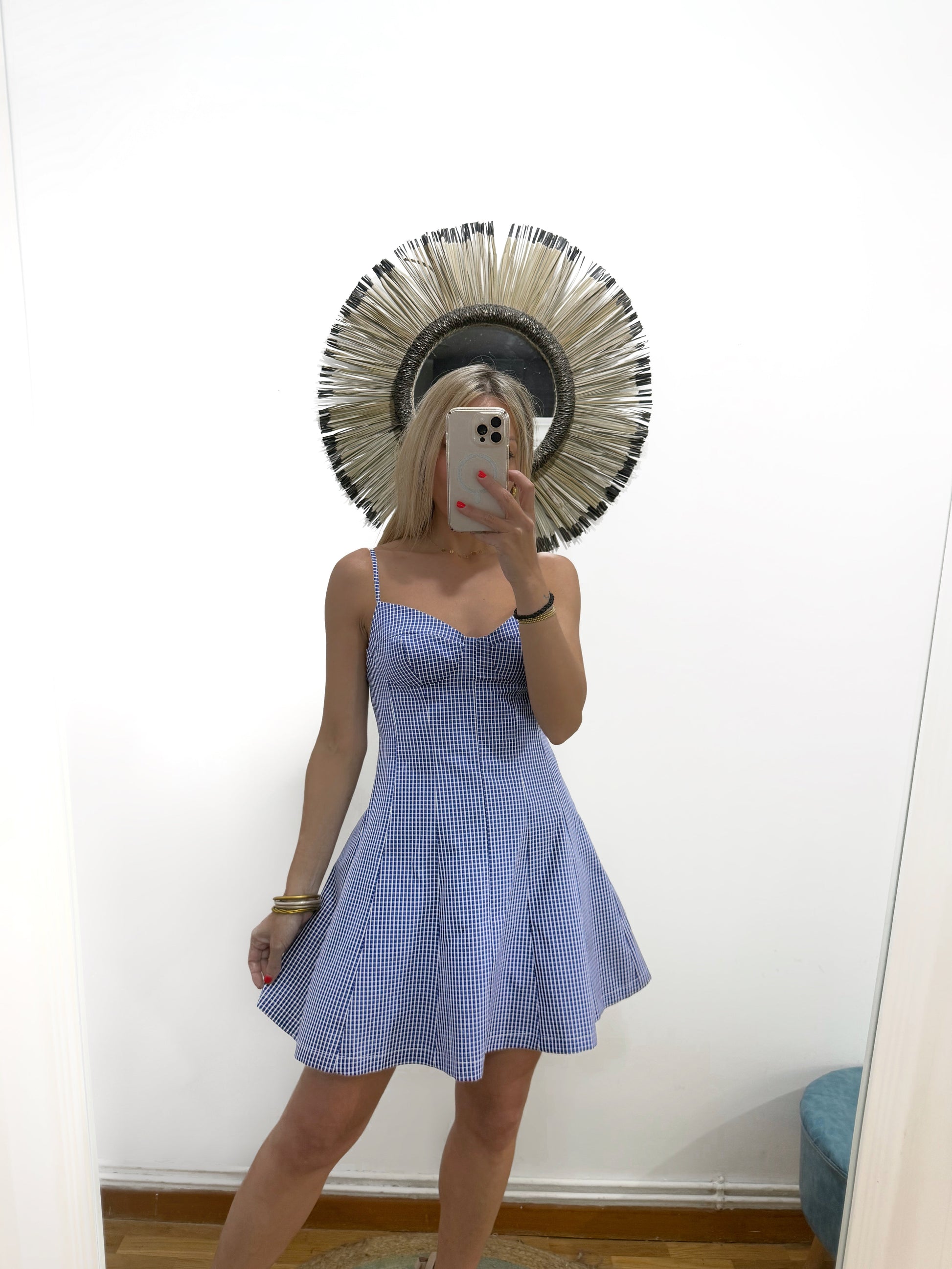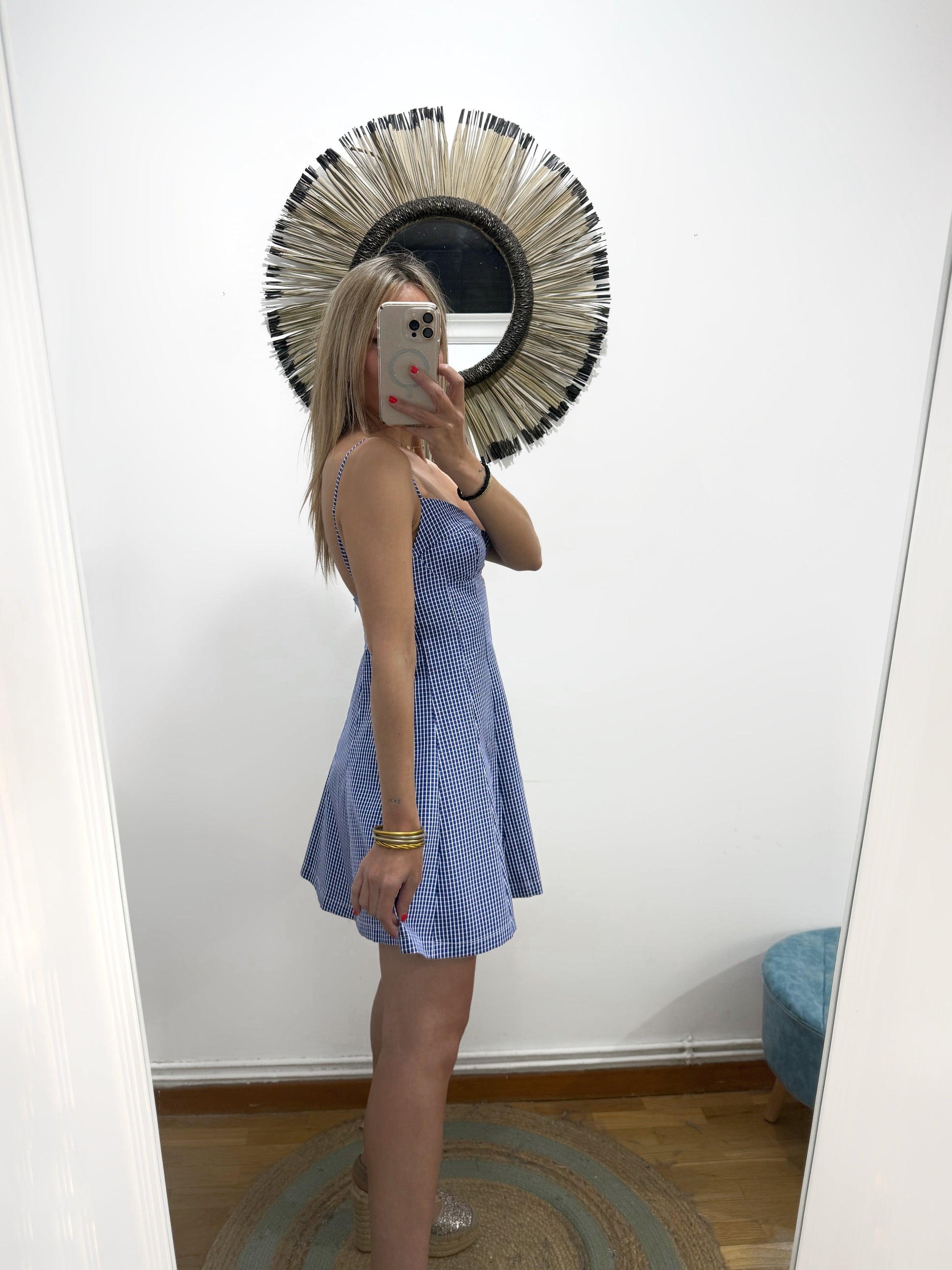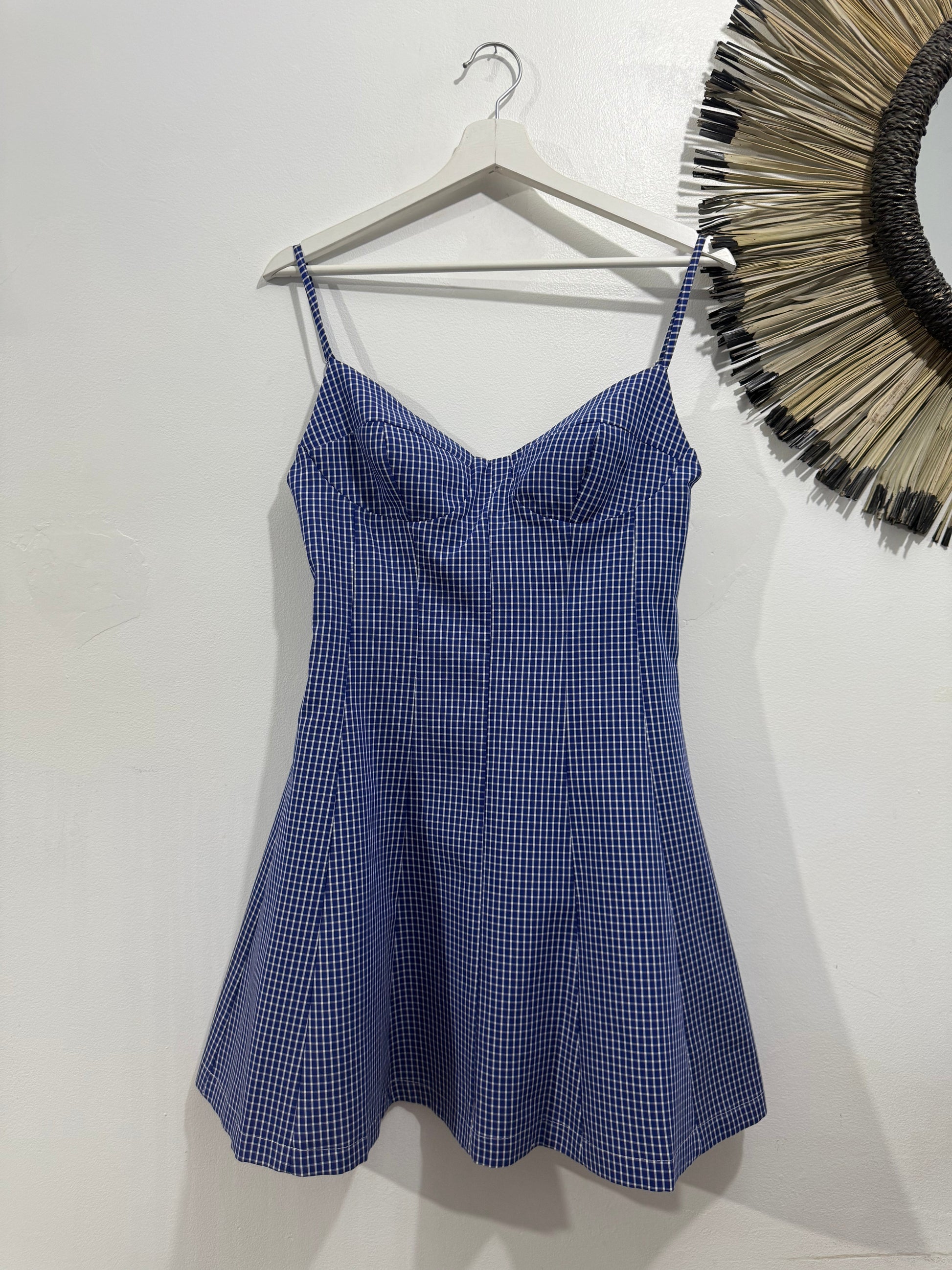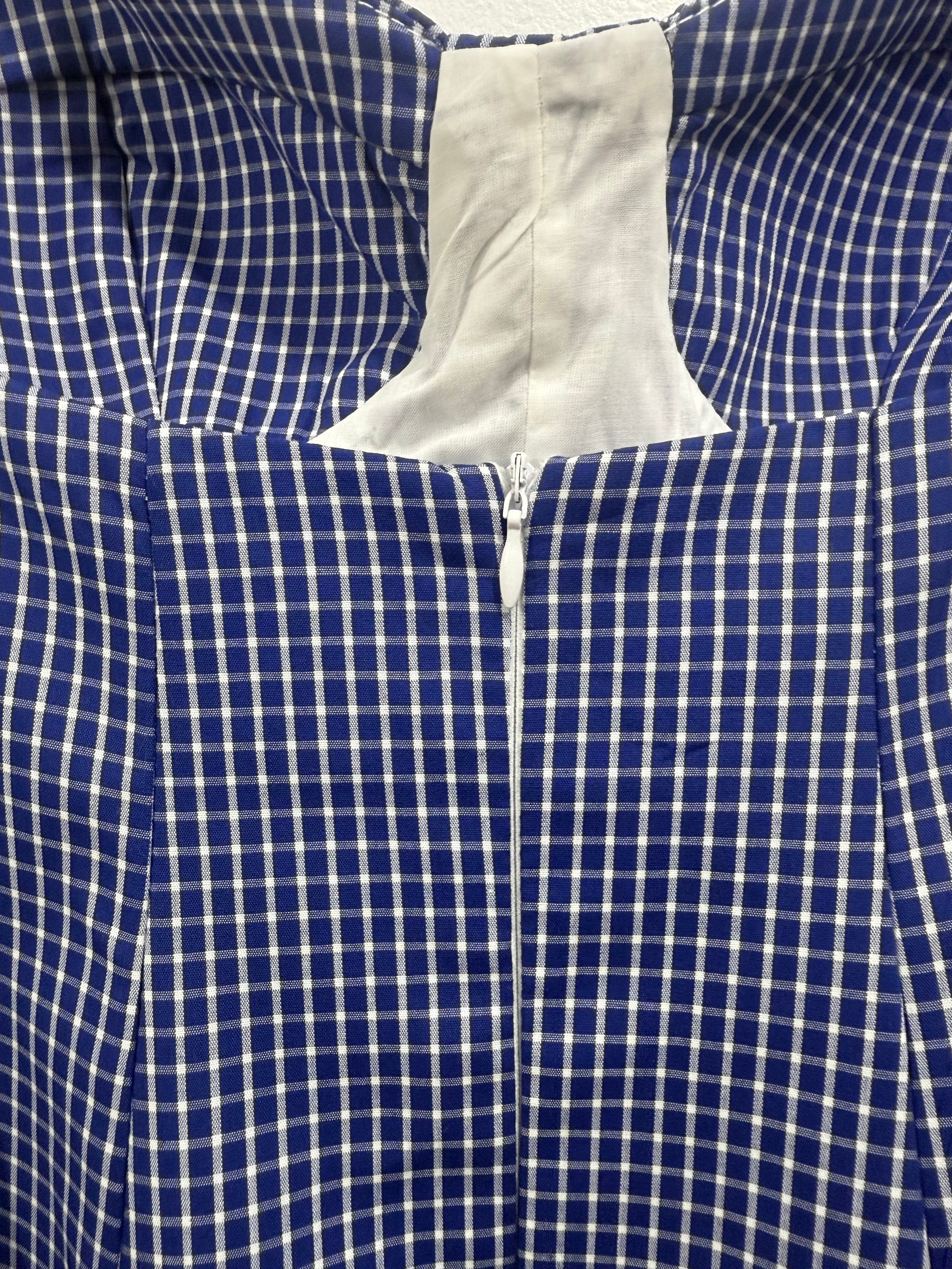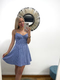 Vestido de cuadrito en azul marino y blanco. Es de tirantes con escote de corazón y cazuelas sin relleno. Tiene pinzas y evase. Queda entallado de cintura y sienta ideal.