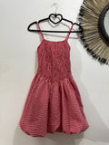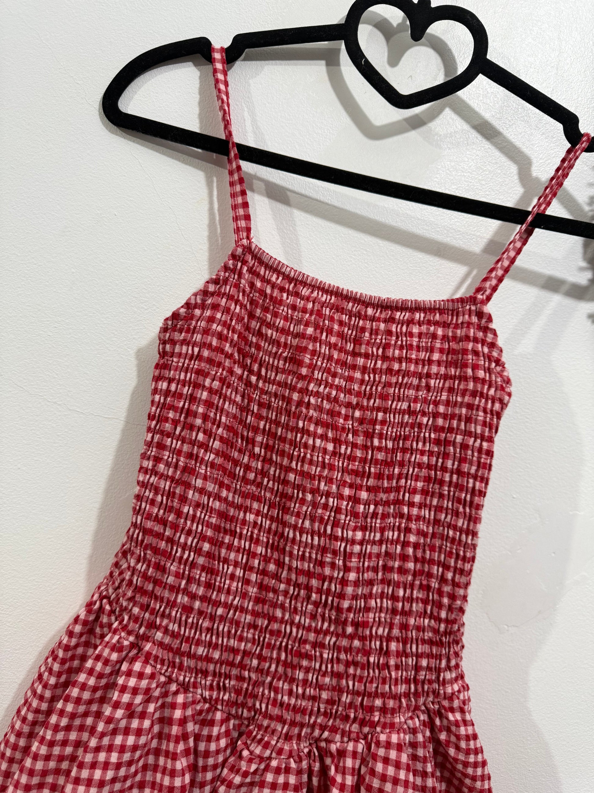 Vestido cortito con cuadro Vichy en blanco y rojo. Es de tirantes y tiene goma de nido de abeja en pecho y espalda hasta la cintura. La falda es abullonada del bajo. Sienta ideal.