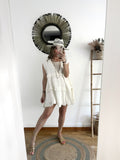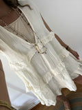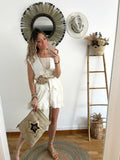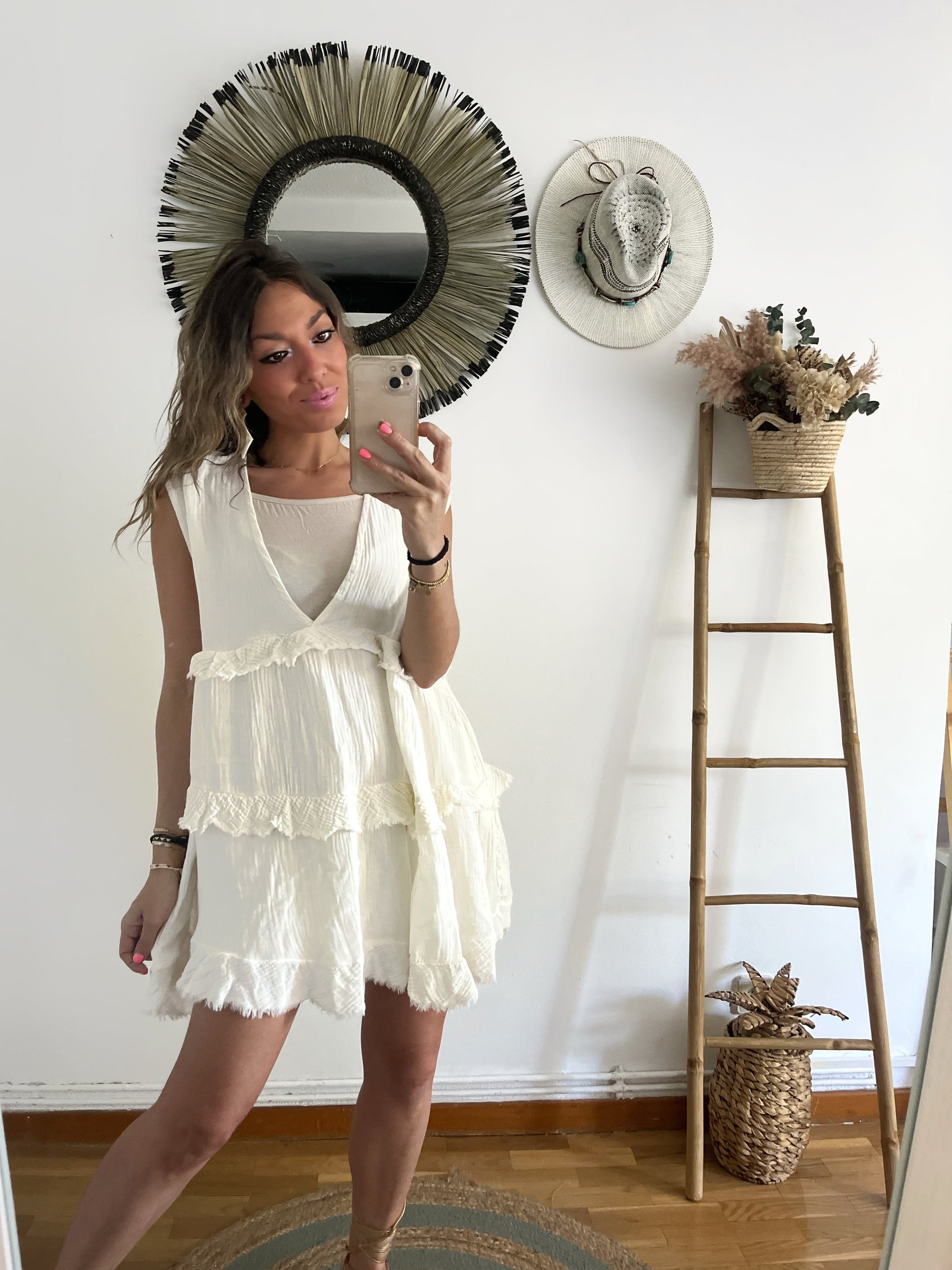Vestido de algodón en color blanco roto. Tiene escote a poco, no tiene mangas y tiene cortes desflecados. Lleva vestido lencero interior con lo cual no transparenta nada. Tiene bolsillos laterales.