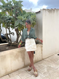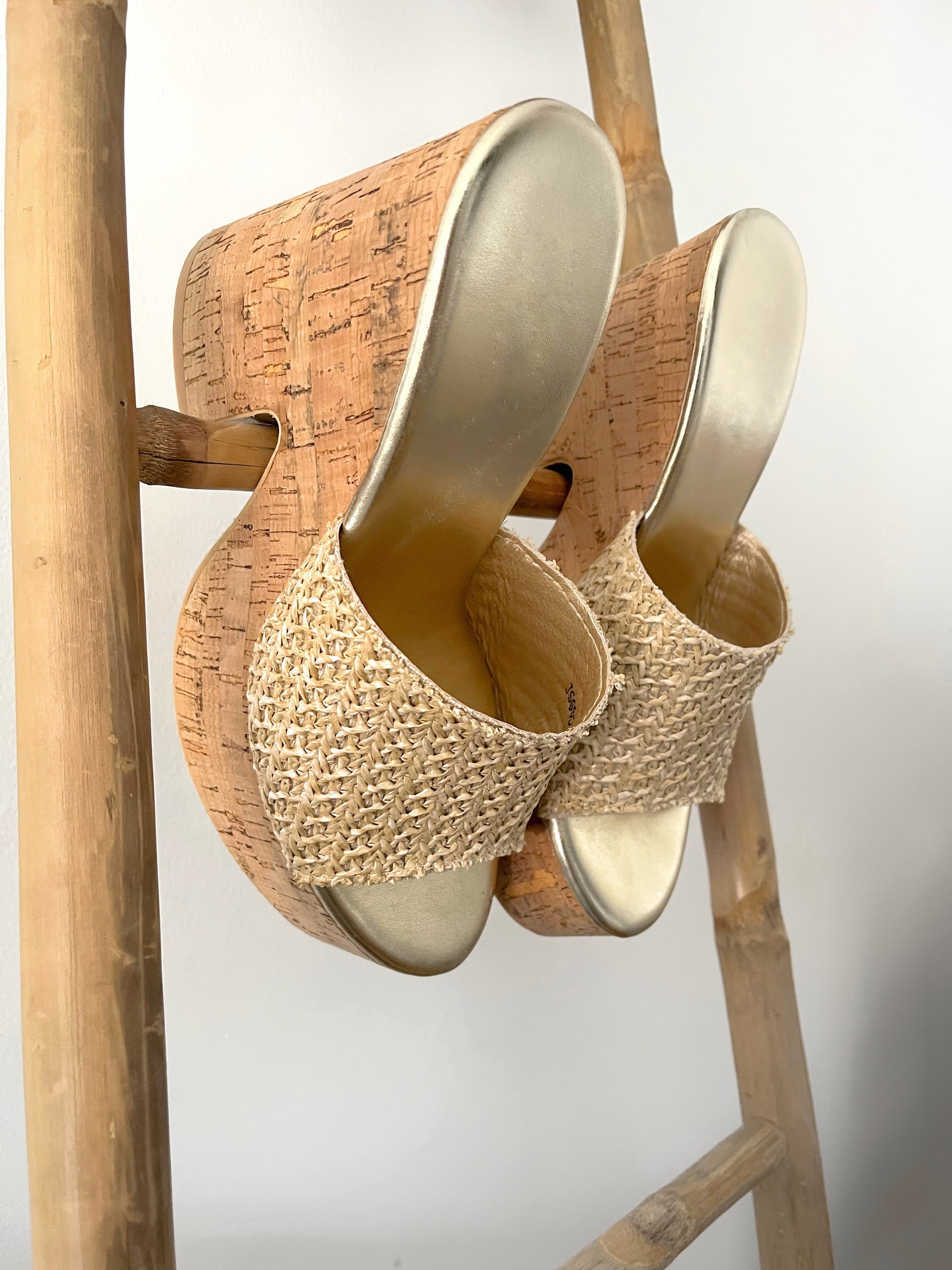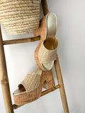 Zueco en color crudo con plataforma de corcho. No pesa nada y son híper cómodos. Se ajustan muy bien al pie. Plataforma delantera 3,5cm. Plataforma trasera 12cm